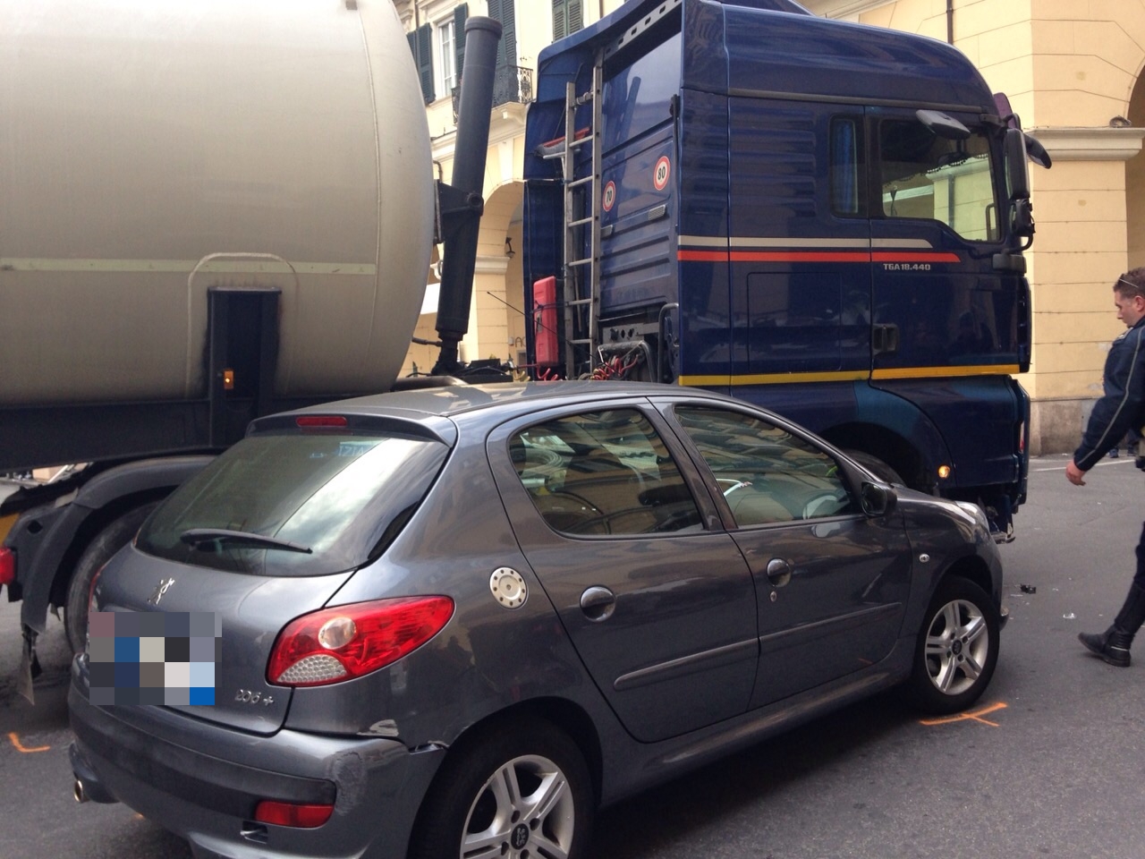 Incidente questo pomeriggio, intorno alle ore 16.45, in via piazza Dante a Imperia, per fortuna senza alcuna conseguenza per i conducenti delle due auto.