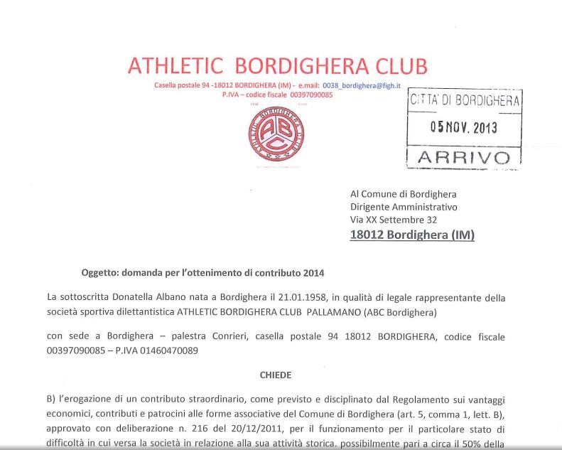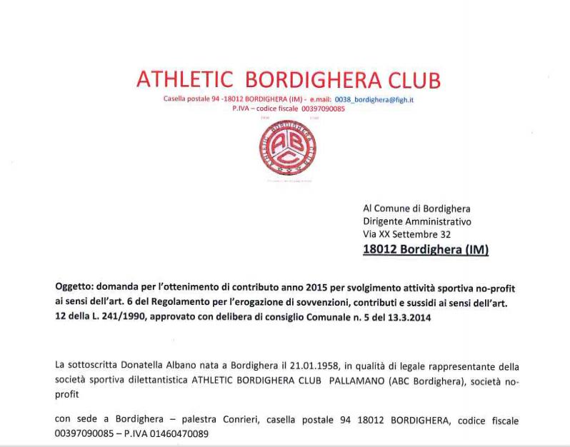 “Smentiamo le parole odierne dell’Assessore Maccario, non è vero che quest’anno nessuna società sportiva ha presentato domanda per ottenere i contributi del Comune previsti secondo l’art. 12 della legge 241/90” affermano i dirigenti dell’ABC Bordighera, “La domanda è stata inoltrata eccome, in data 3 dicembre 2014 tramite p.e.c. , ma il Comune non ci ha mai dato alcuna risposta.”