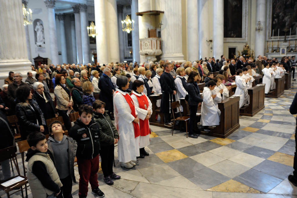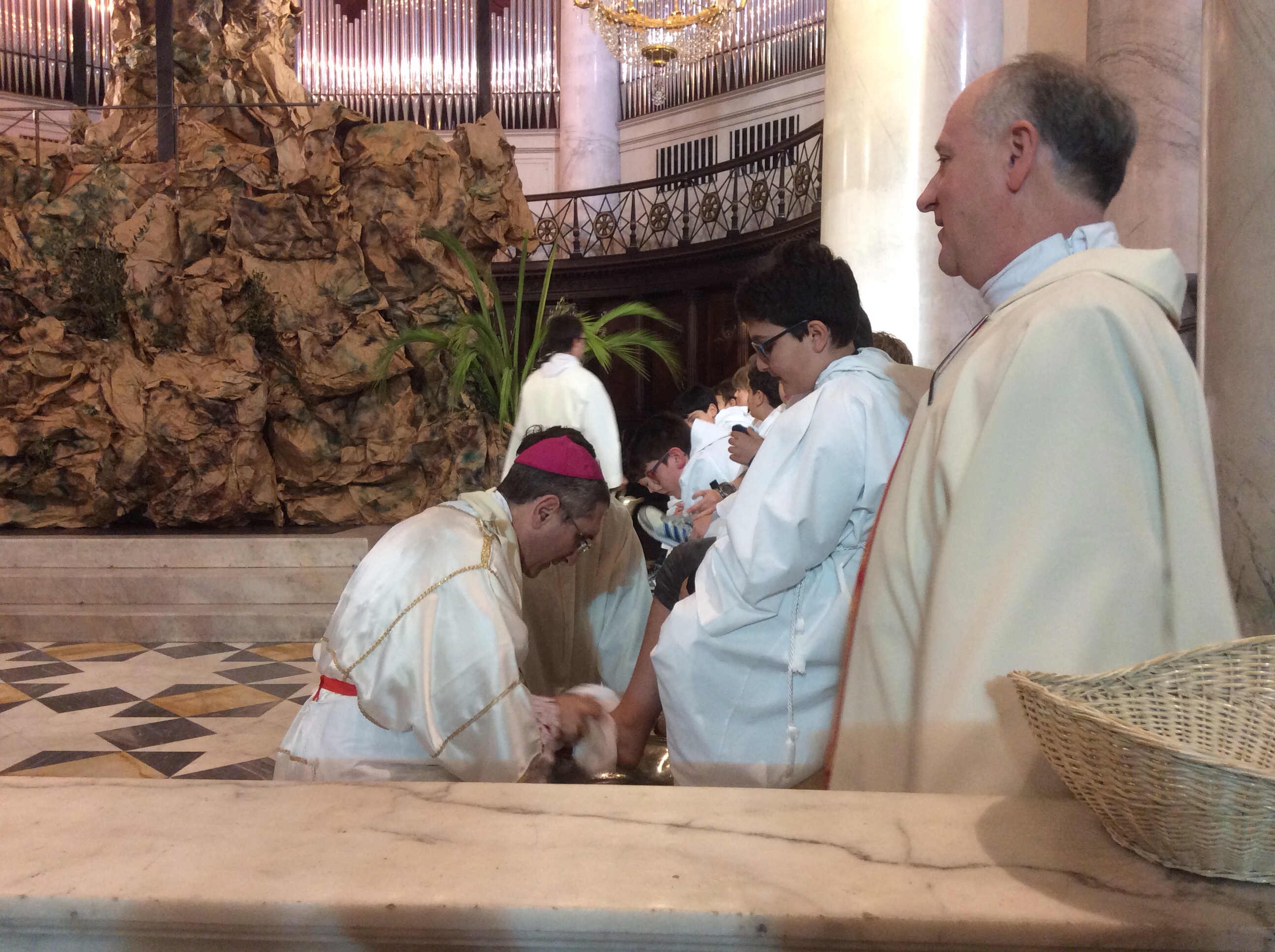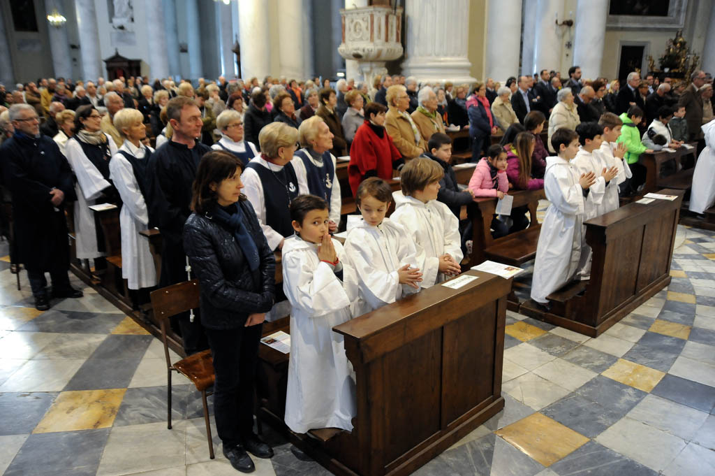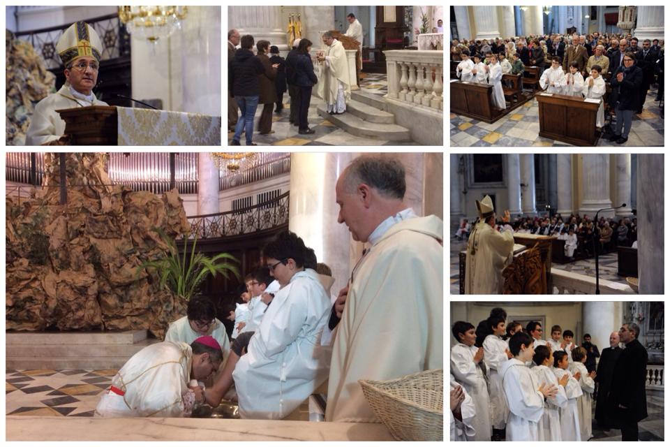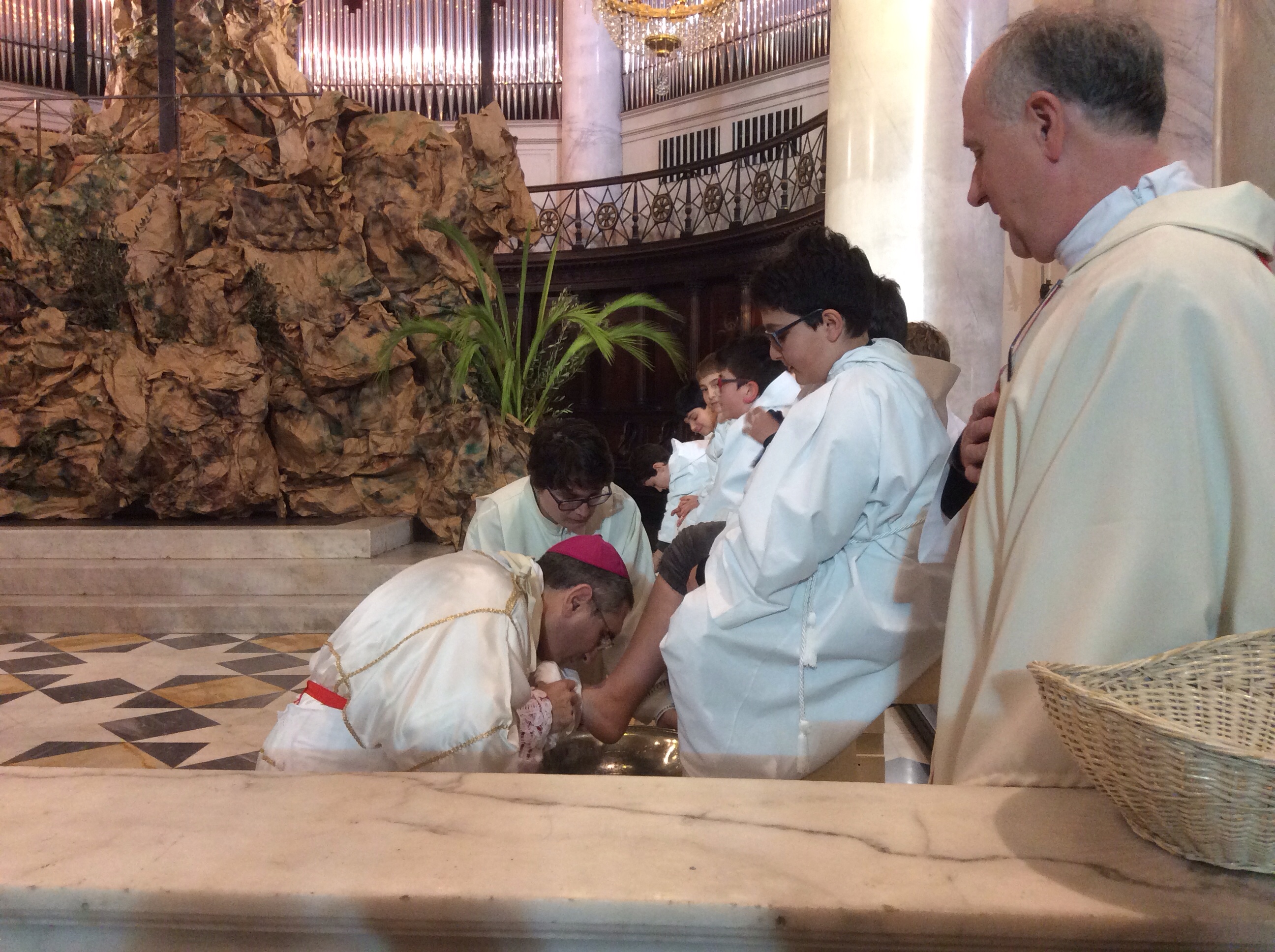 Al termine dell’omelia il Vescovo Monsignor Borghetti ha lavato i piedi ai giovani fedeli che si preparano a ricevere la Prima Comunione. Un momento molto sentito, di profonda commozione per tutti i fedeli presenti.