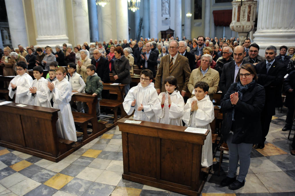 Monsignor Borghetti è arrivato in auto intorno alle 17.50. Un arrivo sobrio, in abiti civili. Dopo un affettuoso saluto con Don Ivo Raimondo, sacerdote della Parrocchia di San Maurizio, l’ingresso nel Duomo, il saluto ai fedeli e ai chierichetti.