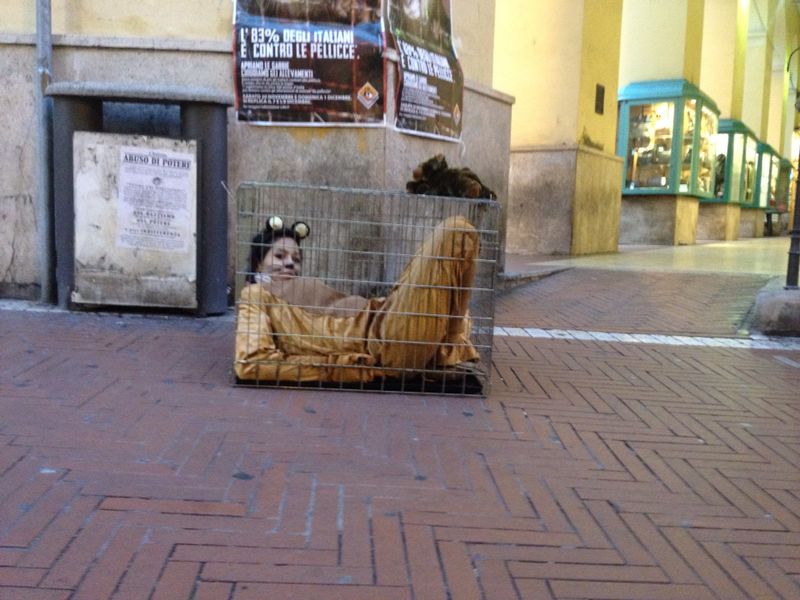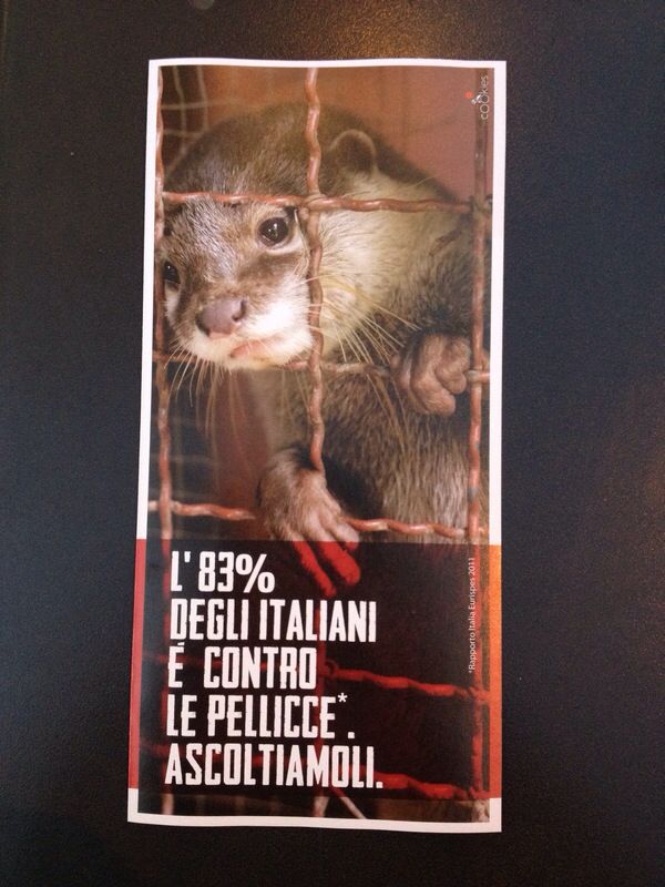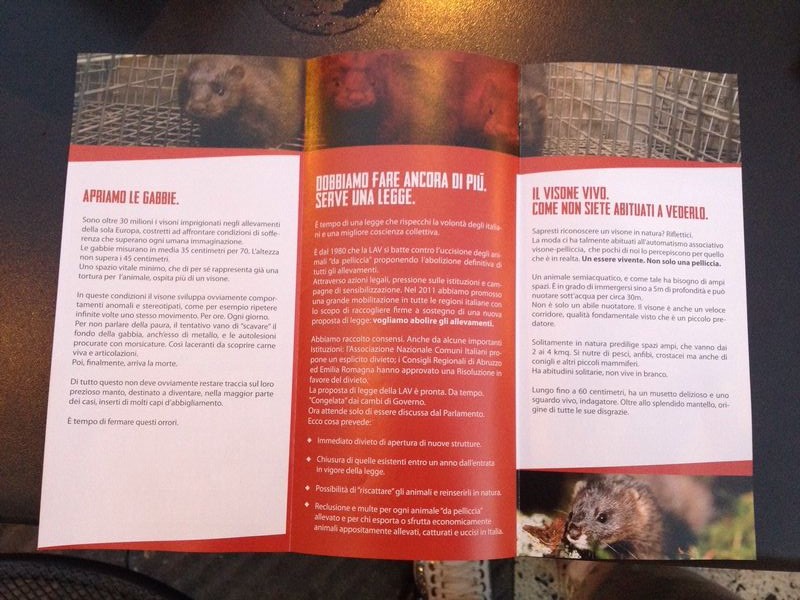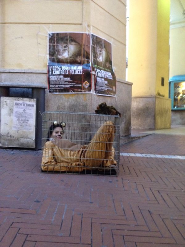 “Avete mai visto un visone in natura? La moda ci ha talmente abituato all’associazione visone-pelliccia che pochi di noi lo percepiscono per quello che è realmente: un essere vivente“. Ad accompagnare il banchetto c’è anche una donna travestita da visone e chiusa in una gabbia al fine di sollecitare ancora di più l’attenzione del pubblico su questo argomento.