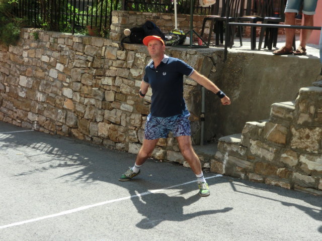 E poi ancora Ranoisio con i suoi, che cede a tarda ora di fronte a Luca Ardissone, mentre è bruciante per Chiapello, che aveva anche una bella squadra con l’esperto Marco Sasso, di fronte agli attempati Corrado Agnese, Roberto Acquarone ed Ernesto “Chicco” Giudice. Per molti, una finale anticipata. Si va addirittura al 4 pari e si vedono meraviglie. Nel girone del mattino di domenica viene fuori un volitivo Matteo Martini che con Paolo Gheza e Franco Calmarini dà inizio alla sua scalata. Saltano i Ventimiglia e gli Arrigo e non è poco. Spettacolo ancora nei quarti, dove emerge il trio di Piero Merano, con i giovanissimi consanguinei Giorgio e Pietro: bel gioco, ma Semeria con Davide Somà in battuta e Paolo Somà davanti ne vengono fuori con l’esperienza. Per il resto, tutto come da copione, i valori tecnici si esaltano a dispetto del gioco di fili spigoli pietre asfalto e Dio solo sa cosa, caratteristica del gioco locale. Delle due semifinali, la preferenza va a quella tra Roberto Bernardi, Luca Lepri e Luca Bianchino, finora sornioni, di fronte a Matteo Martini, Paolo Gheza e Franco Calmarini. Signori, un’ora e un quarto di battaglia, in cui due battitori d’eccezione hanno fatto la differenza qualitativa.