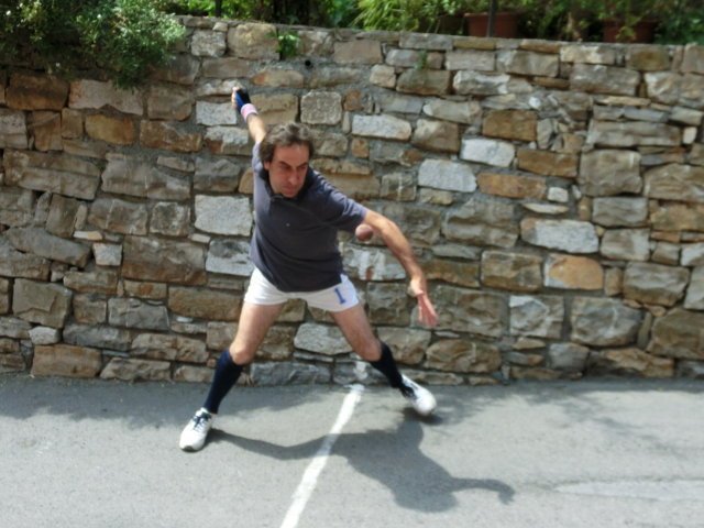 Roberto Bernardi esperto e ficcante, Martini a tratti arrembante. E tanto gioco dei terzini, soprattutto di Bianchino e di un Luca Lepri a cui va il “colpo del torneo”, volée alta dalla discesa su ribattuta a mano aperta di Martini. I 4 pari sono interminabili e però sarà Calmarini a mettere la firma sul 5 a 3 finale. Stesso punteggio tra il trio di Corrado Agnese e quello di Moltedo, con i Somà sugli scudi e Semeria in cabina registica. In effetti, fresco, l’alfiere di Chiusavecchia va via, ma sul 4 a 1 c’è un passo a vuoto che permette la rimonta di Moltedo. Non mancano momenti di tensione. E si va alla finale, tanto attesa, ormai alle sette di sera. Corrado contro Martini. I vecchi calibri contro la gente del comune di Pontedassio. Inizio teso, pubblico in silenzio. Corrado va in vantaggio. Si scelgono le palle bianche. La visibilità è scarsa. Martini diventa aggressivo. 1-1. La battuta fa la differenza, si vedono scambi e palline scagliate fra gli orti, là dove nessuno arriverà. Martini scalda, va sul 3-1. Ma Corrado e i suoi sono “duri a morire”. Infatti si va sul 3-3 pari. Si riparte. La finale rispetta le attese. Martini forza la battuta e compie falli. Perde, di muovo. Ma sarà ancora la battuta a fare la differenza. Più turni di lancio per Martini e alla fine le tre battute miracolose. Sul 4 pari 40 pari. Dall’altra parte non c’è risposta e finisce così tra gli applausi, il sorriso di Martini, l’urlo di Gheza, la capriola di Calmarini.