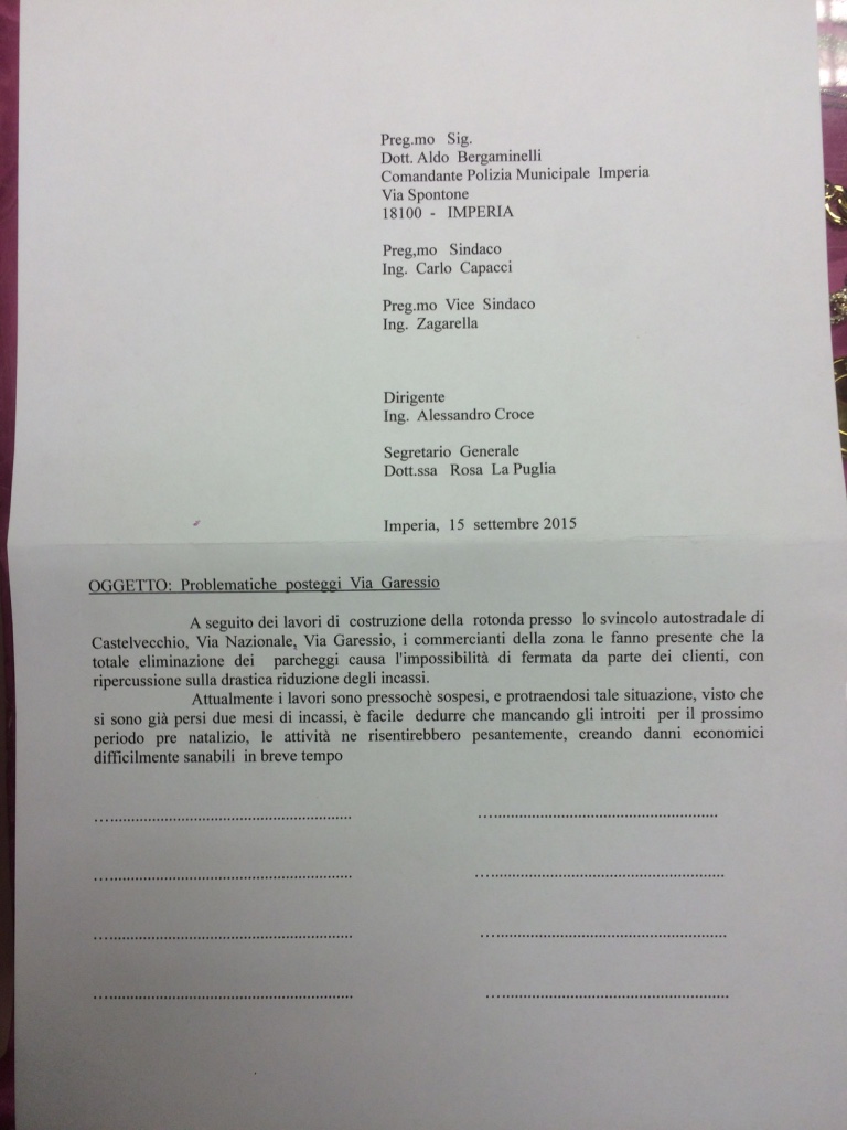 Imperia. Commercianti della parte bassa di Castelvecchio sul piede di guerra per la nuova viabilità legata alla realizzazione della nuova rotatoria. L’edicola la panetteria, il frutta e verdura, la merceria, il negozio piscine e il bar ristorante si trovano tutti nella stessa situazione di forte disagio legato alla rimozione dei parcheggi che si trovavano davanti alle loro attività che hanno causato la perdita di 2/3 del fatturato nell’ultimo mese.