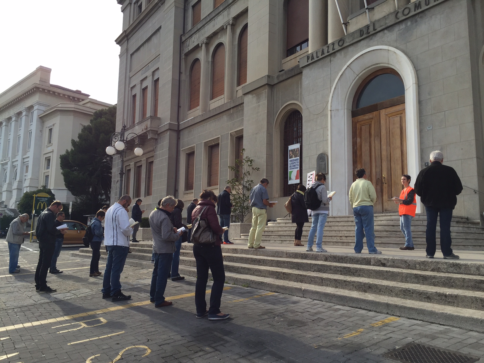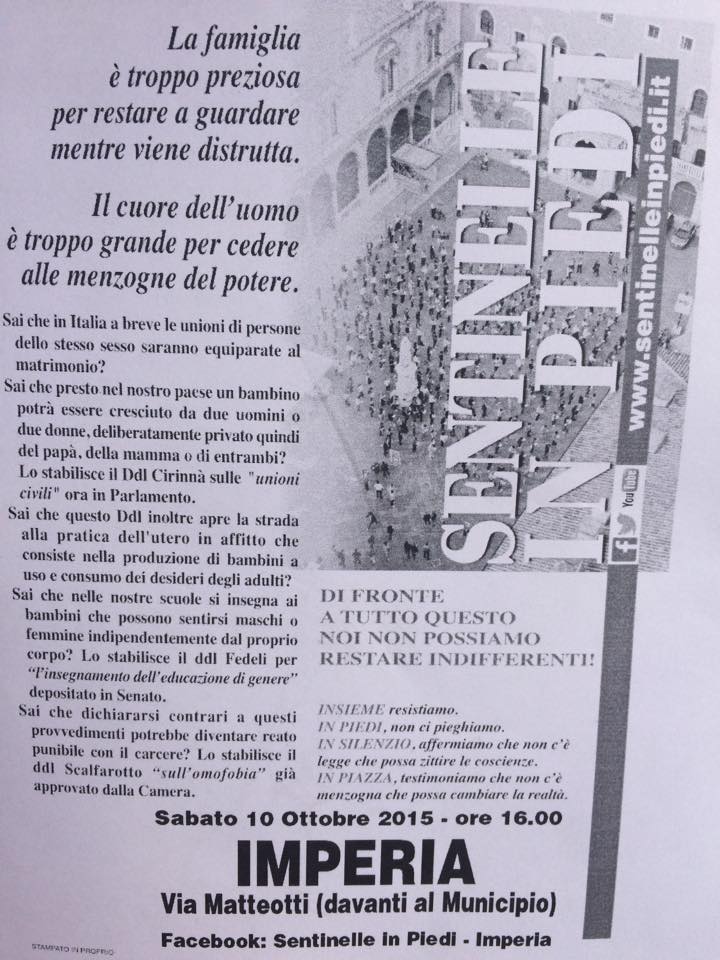 Imperia – Dalla scorsa volta si sono dimezzati e fra loro non si registrano più esponenti politici. Erano 25 le “Sentinelle in Piedi” che, questo pomeriggio, hanno “vegliato” davanti al Comune di Imperia, in difesa della famiglia tradizionale, contro le unioni civili di persone dello stesso sesso, contro la possibilità di adozione da parte di una coppia gay o lesbica, contro la pratica dell’utero in affitto e contro il DDL Fedeli sull’insegnamento dell’educazione di genere.