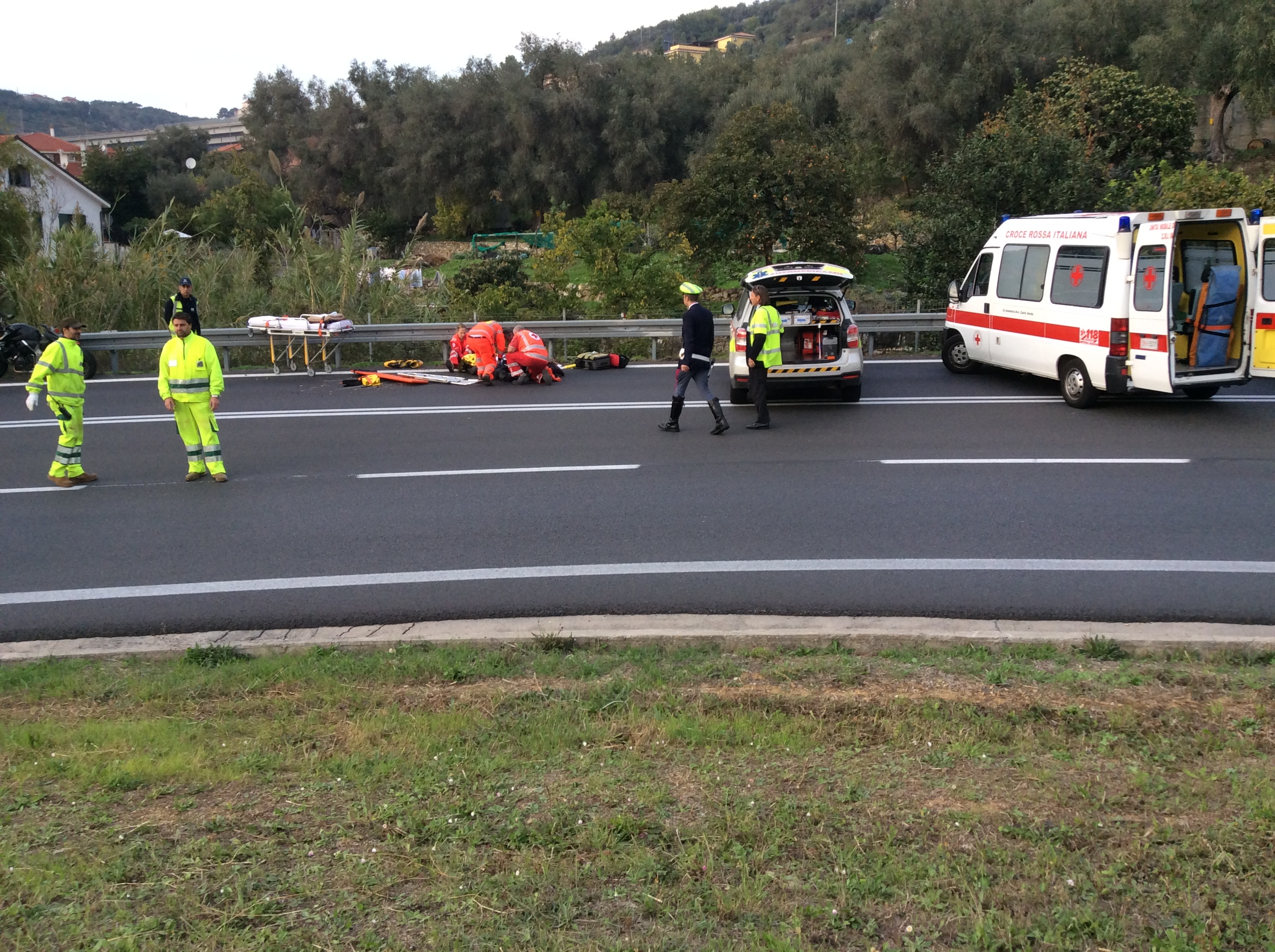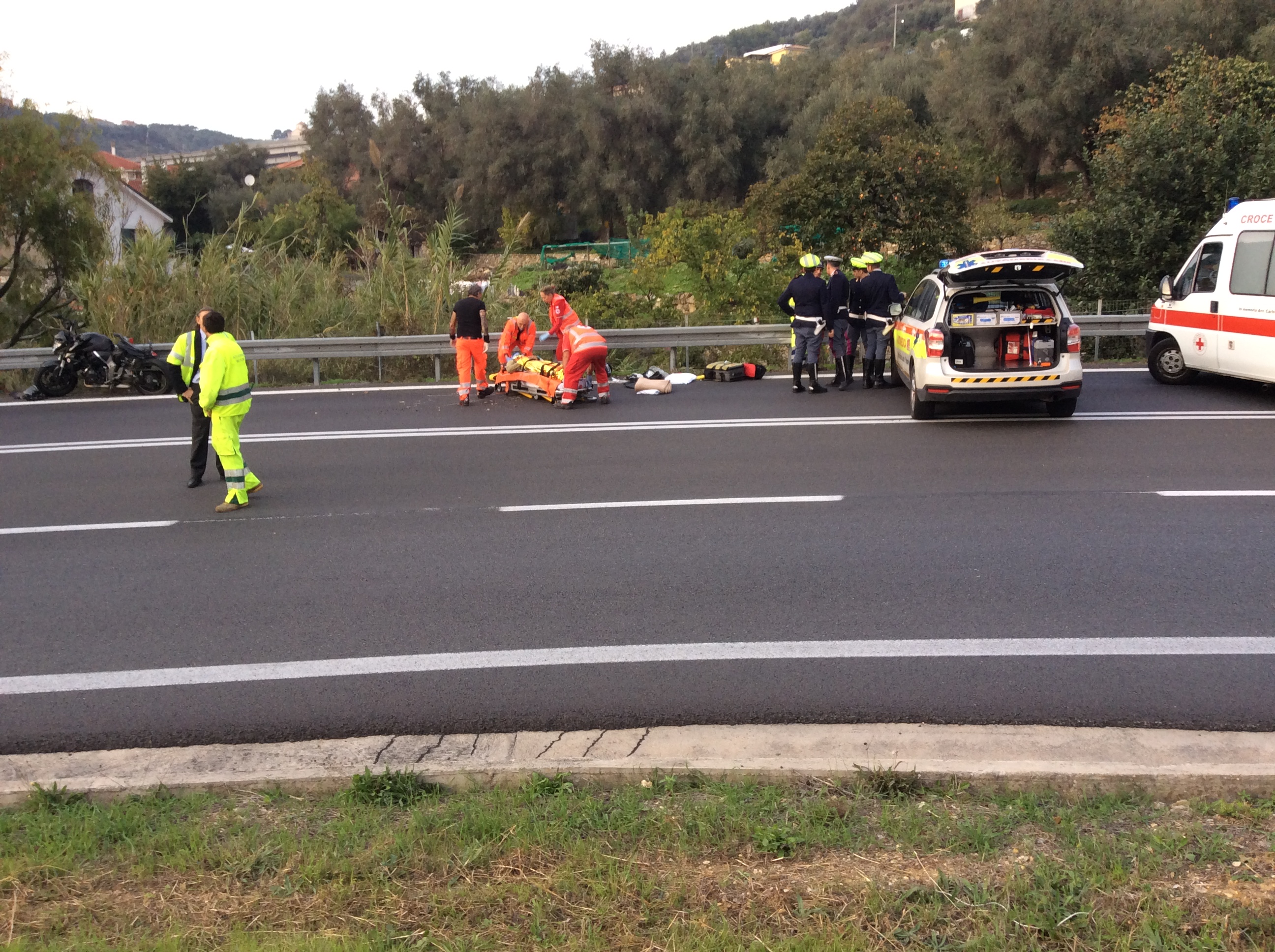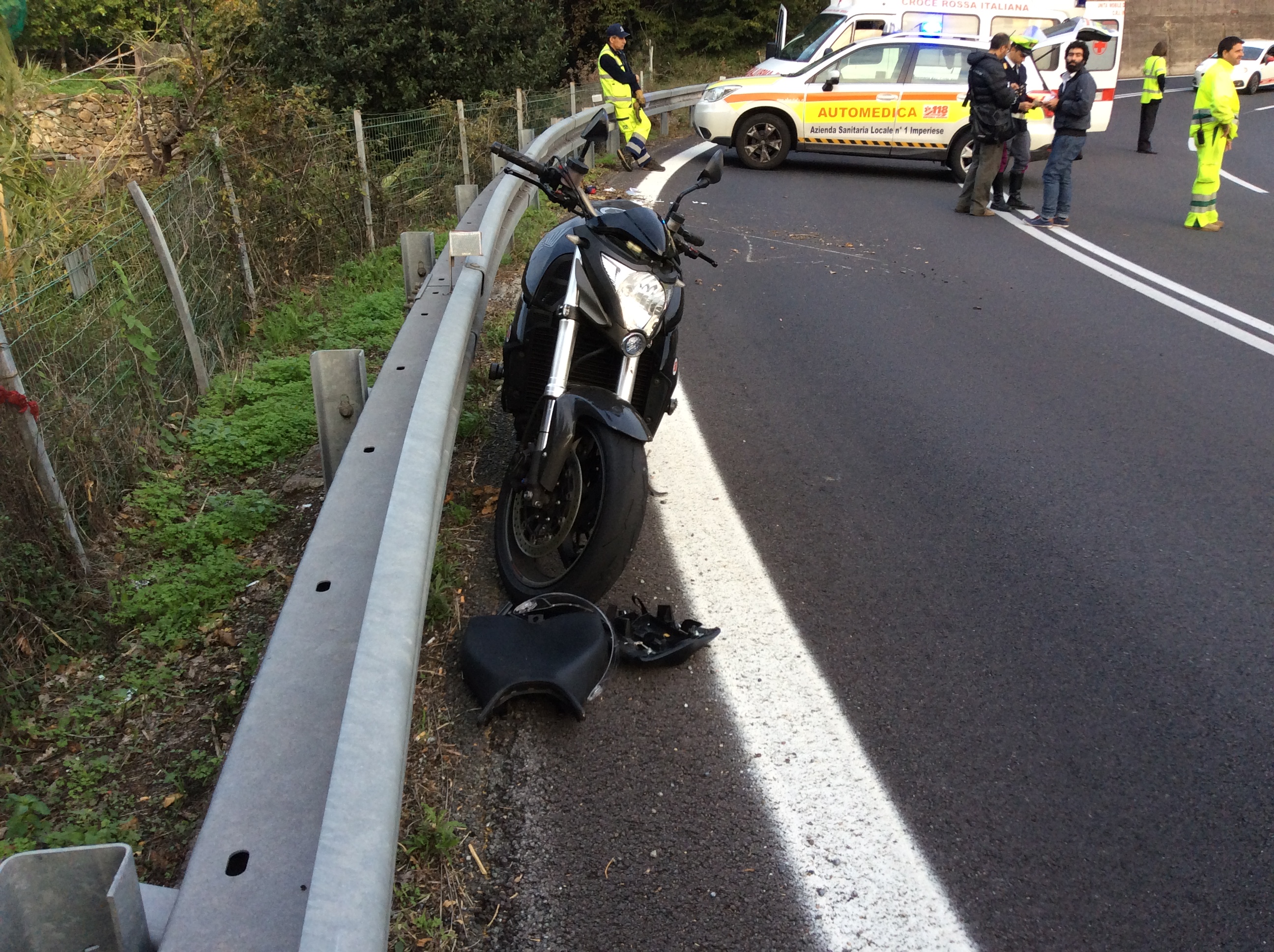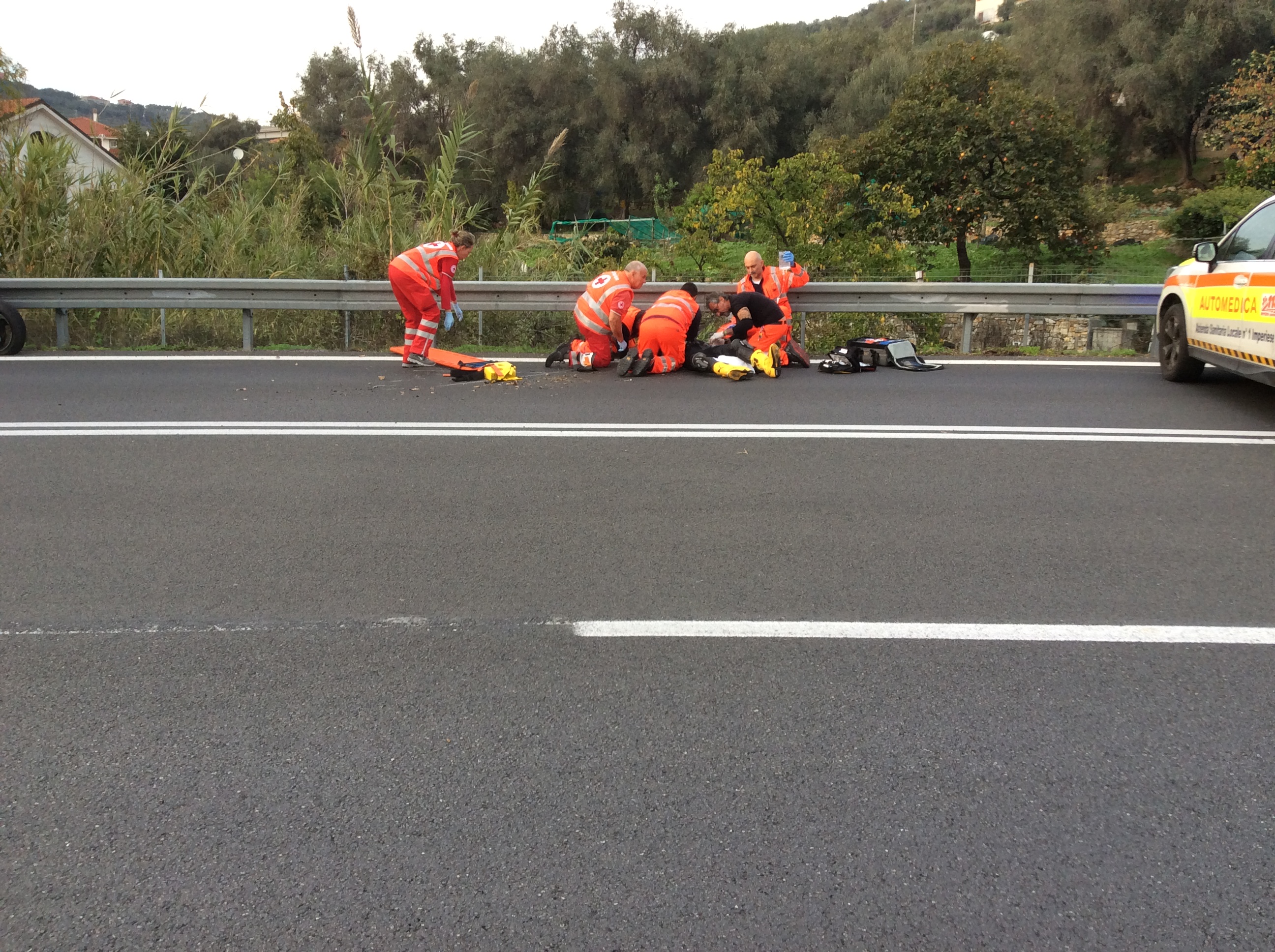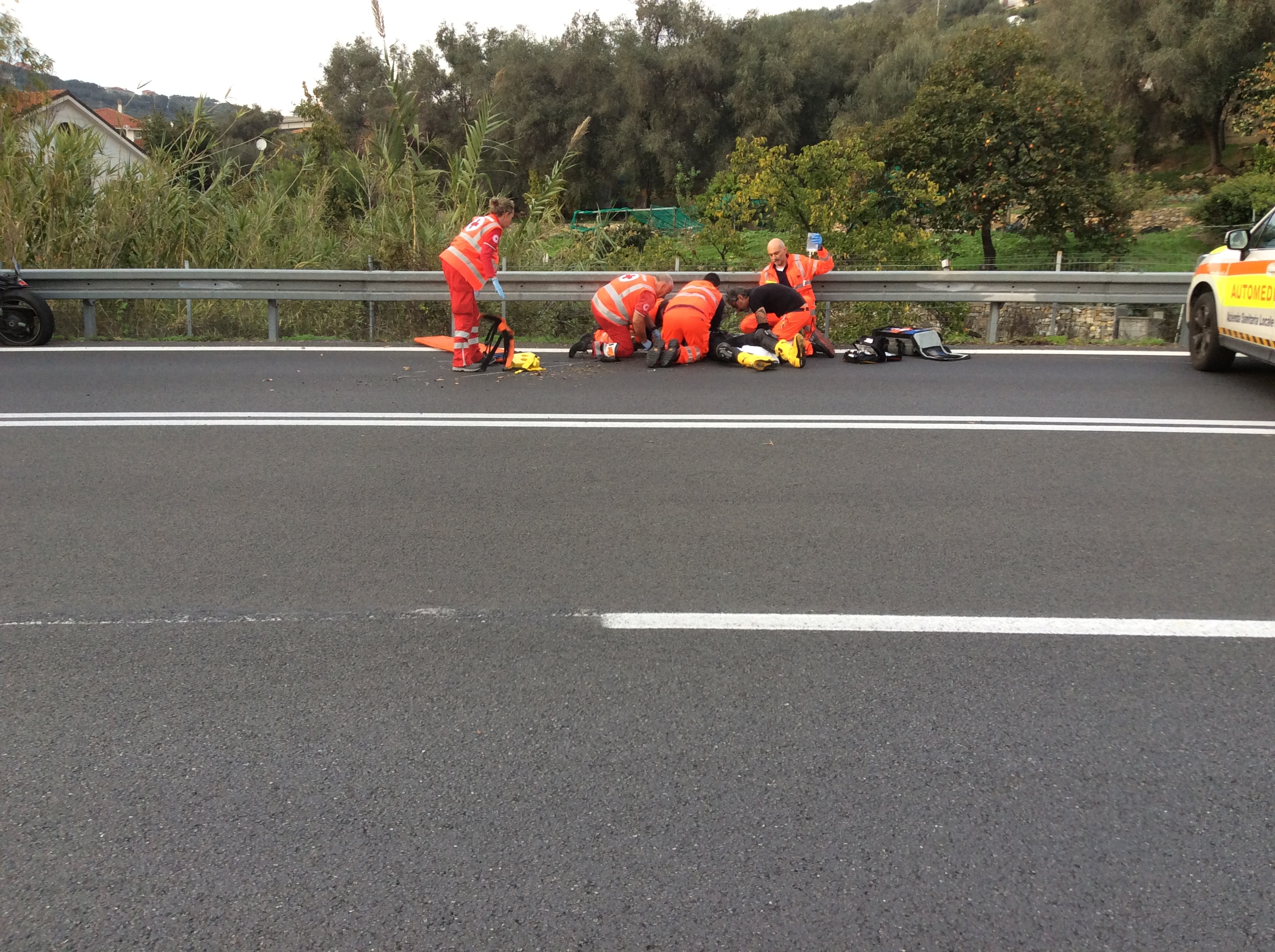 Grave incidente stradale questo pomeriggio nei pressi dello svincolo autostradale di Imperia Est. Un giovane di 25 anni, S.M., per cause ancora in fase di accertamento, ha perso il controllo della sua moto mentre era diretto verso Imperia. Non è chiaro se la moto abbia o meno impattato contro il muro o il guardrail prima di terminare la sua corsa al lato della carreggiata.