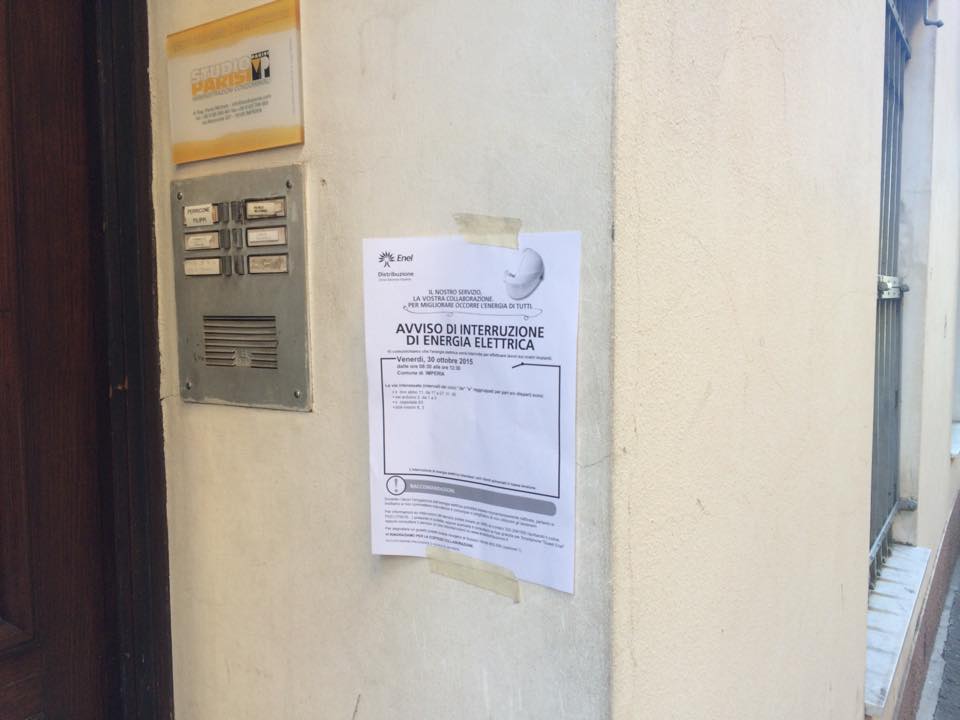 Imperia – Senza corrente elettrica per un’intera mattinata per via di alcuni lavori eseguiti dai tecnici dell’Enel. È successo questa mattina in via Don Abbo, “vittime” alcuni esercenti commerciali, sul piede di guerra per il preavviso minimo da parte degli organi competenti. I tecnici si sono presentati sul posto intorno alle 8 del mattina per intervenire su due scatole di derivazione. I commercianti sono stati avvisati solo ieri, giovedì 29 ottobre, senza avere il tempo materiale di organizzarsi per tempo e di avvisare la clientela.