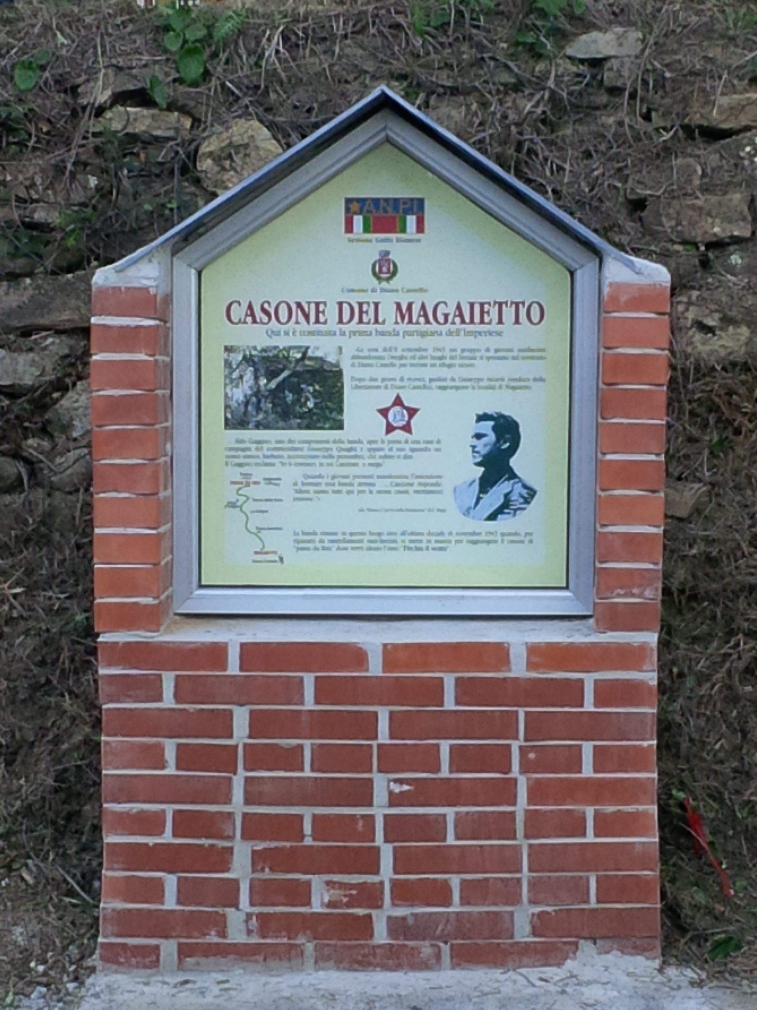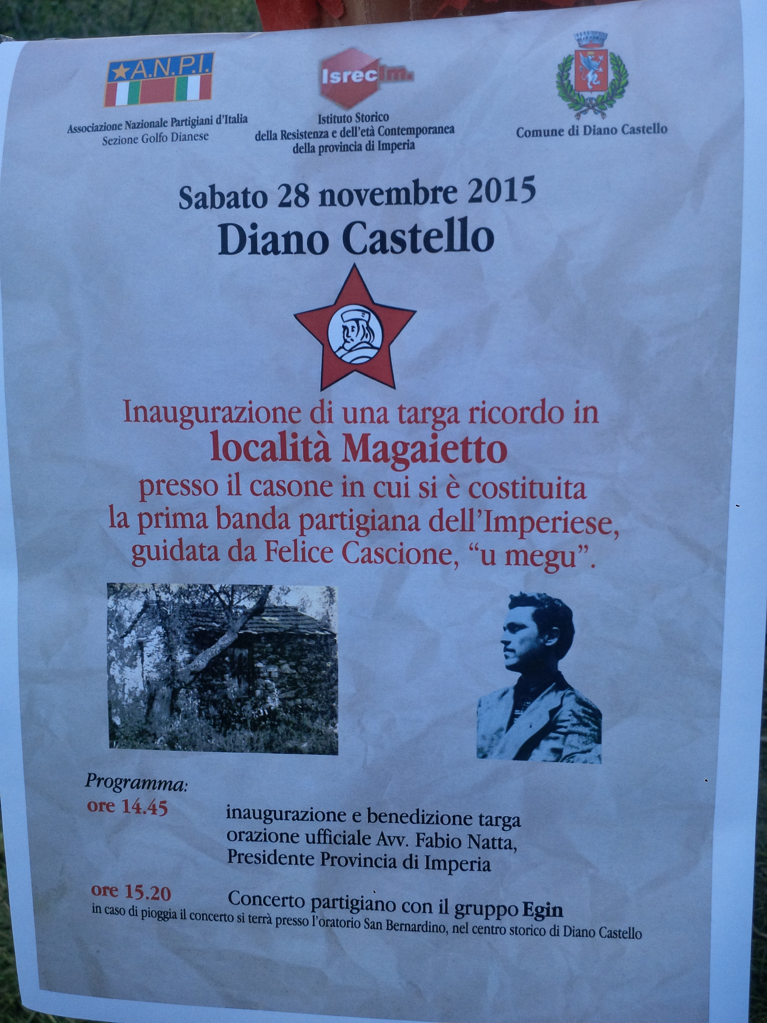 Si é tenuta ieri pomeriggio la festa per l’inaugurazione della targa posta in ricordo della costituzione della prima banda partigiana dell’ imperiese, quella guidata da Felice Cascione. Era l’11 settembre 1943 quando si riunirono in questo Casone, chiamato del Magaietto, i primi partigiani. Alla cerimonia, organizzata dall’Anpi del Golfo Dianese, hanno partecipato i partigiani Tonino Simondi e Carlo Trucco raccontando aneddoti toccanti.