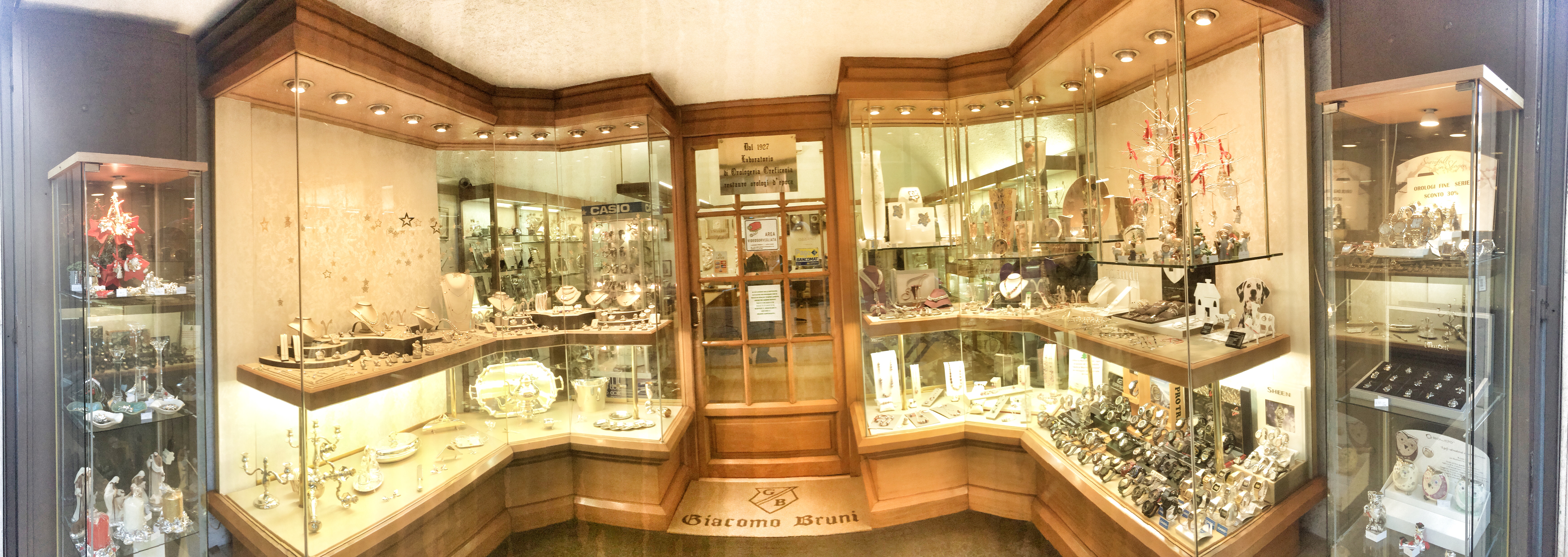 Il negozio ebbe inizio nell’allora centrale via Carlo Alberto in un piccolo locale al crocevia con la galleria Gastaldi e via D’Azelio (Ora via Cascione 90). Negli anni ’30 all’attività di riparazione si affiancò quella della vendita di orologi e con la ripresa economica degli anni ’50 iniziò la vendita di preziosi. Negli anni ’70 al nonno ormai anziano subentrò Giacomo che insieme a sua moglie, ingrandirono l’azienda spostando nel 1983 il negozio dal piccolo magazzino di via Cascione 90 alla sede attuale al civico 106. Aumentando la superficie espositiva il negozio si arricchì con l’articolo da regalo: argenteria, posateria in argento, quadri sacri, vasellame d’autore, cornici porta ritratto. Nel 2002 si costituisce la società “Giacomo Bruni S.A.S” di cui Andrea Bruni è il titolare.