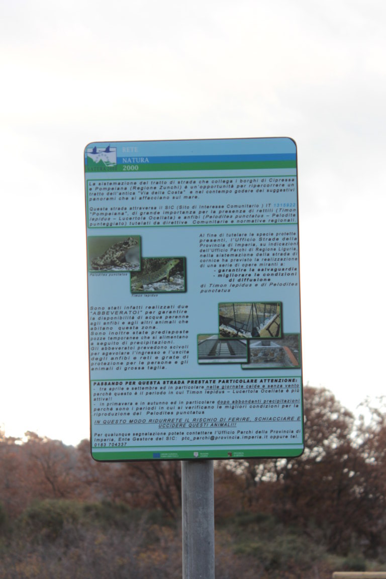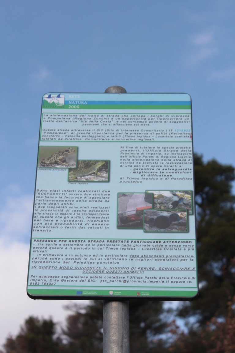 Il percorso, a tratti asfaltato e a tratti sterrato, con vista mare, è lungo circa 3km, largo 3 metri e può essere percorso in entrambi i sensi con la propria auto, in bicicletta o a piedi. La particolarità sta nella presenza di “rospidotti”, particolari percorsi che permettono appunto ai rospi di poter attraversare la strada senza essere schiacciati dalle auto in transito. Sono presenti anche delle vasche di riproduzione. Lungo il percorso, se si è fortunati, è possibile anche vedere delle Lucertole Occellate, tipiche della zona.