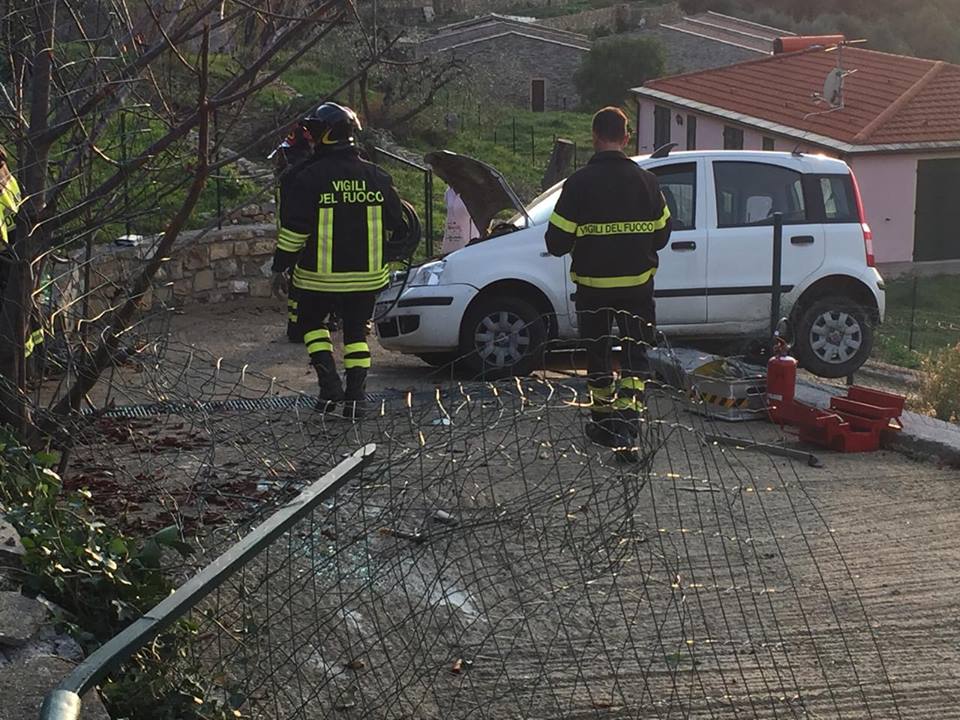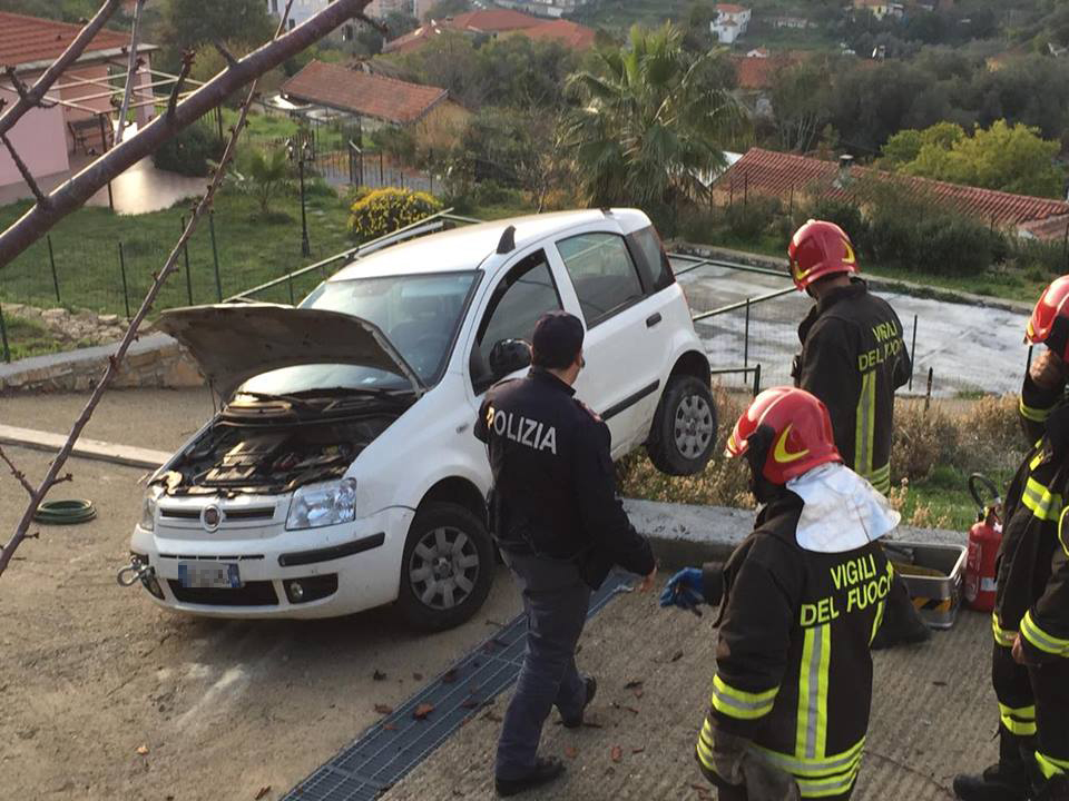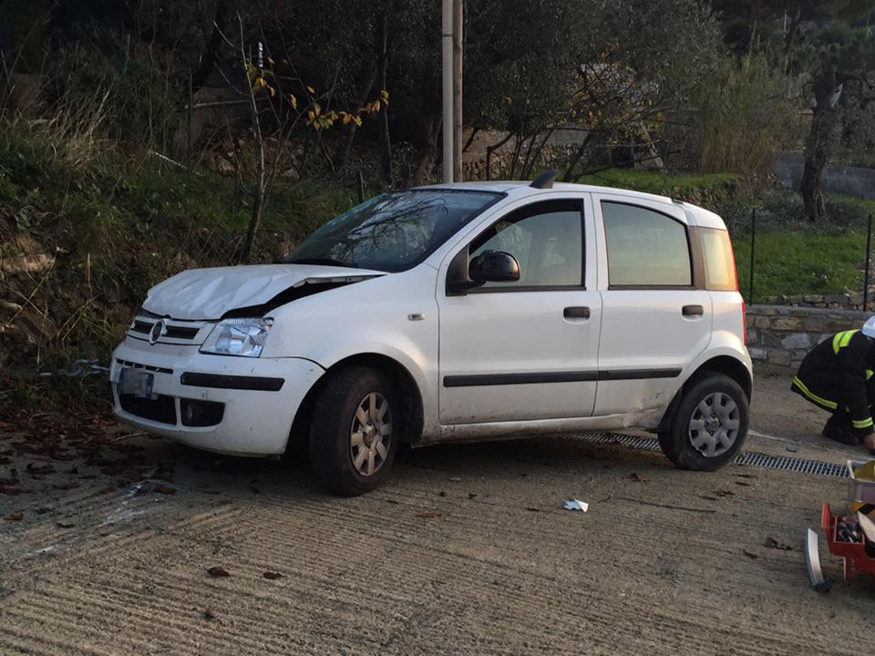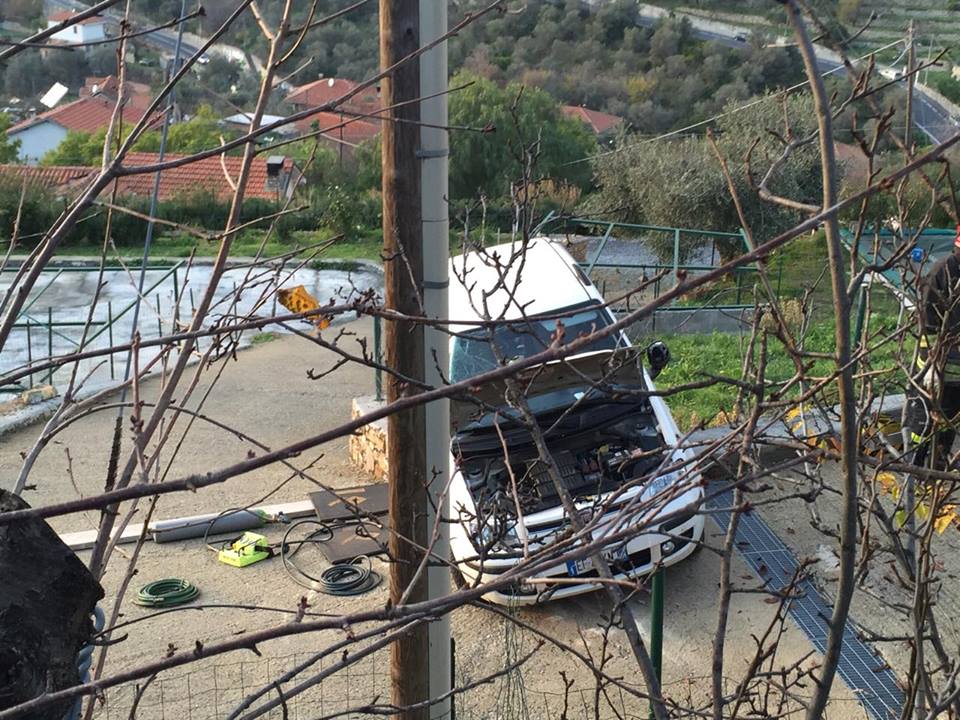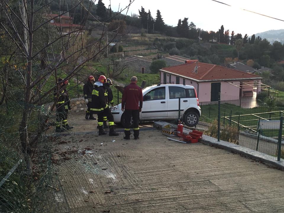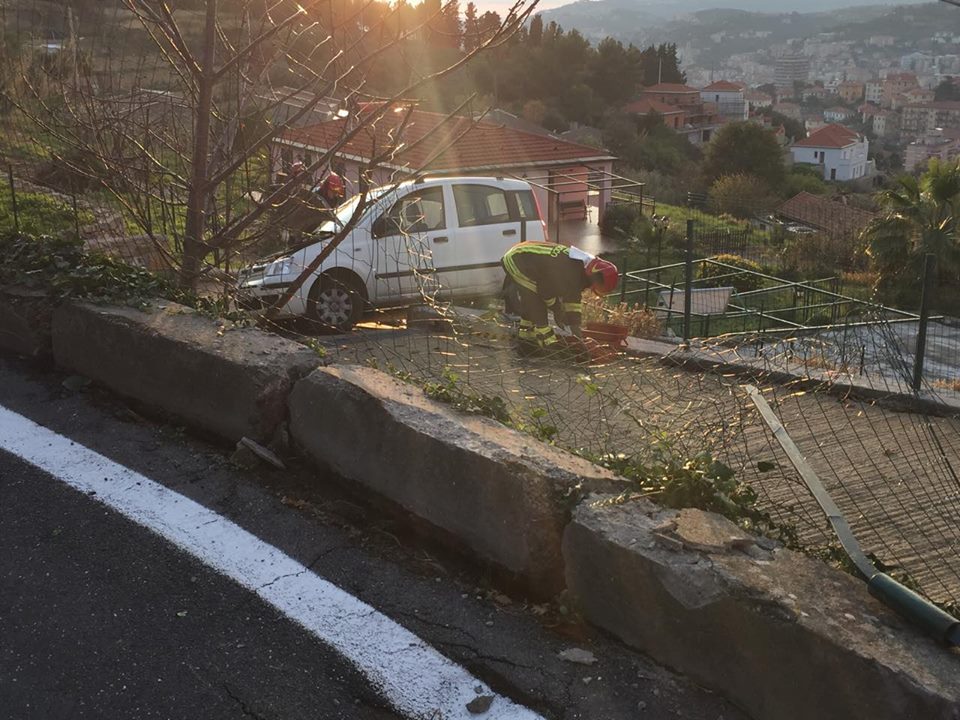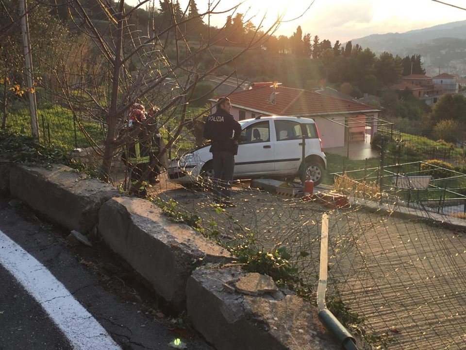 Imperia. Poteva finire in tragedia l’incidente avvenuto attorno alle 16 di questo pomeriggio in via Diano Calderina a Oneglia.Una donna, R.O. di 65 anni, probabilmente a causa di un malore è precipitata fuori strada volando con la sua auto, una Fiat Panda, nel vialetto di ingresso di alcune villette. La corsa dell’auto, fortunatamente è stata fermata da alcuni paletti e da un muretto di recinzione rimanendo però in bilico.