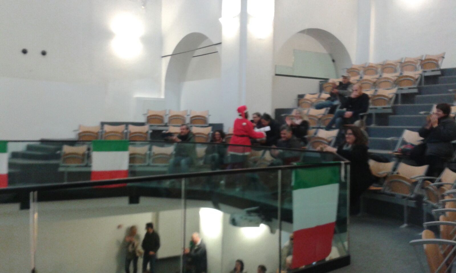 I ragazzi hanno anche simpaticamente incontrato il pubblico quando, sulle note di un brano rap, travestiti a Babbo Natale sono scesi in platea per distribuire caramelle.