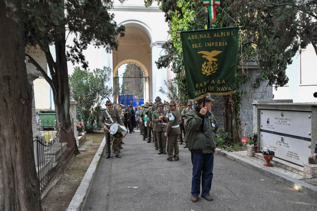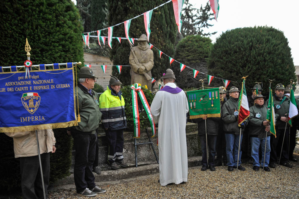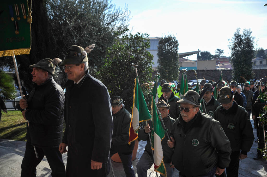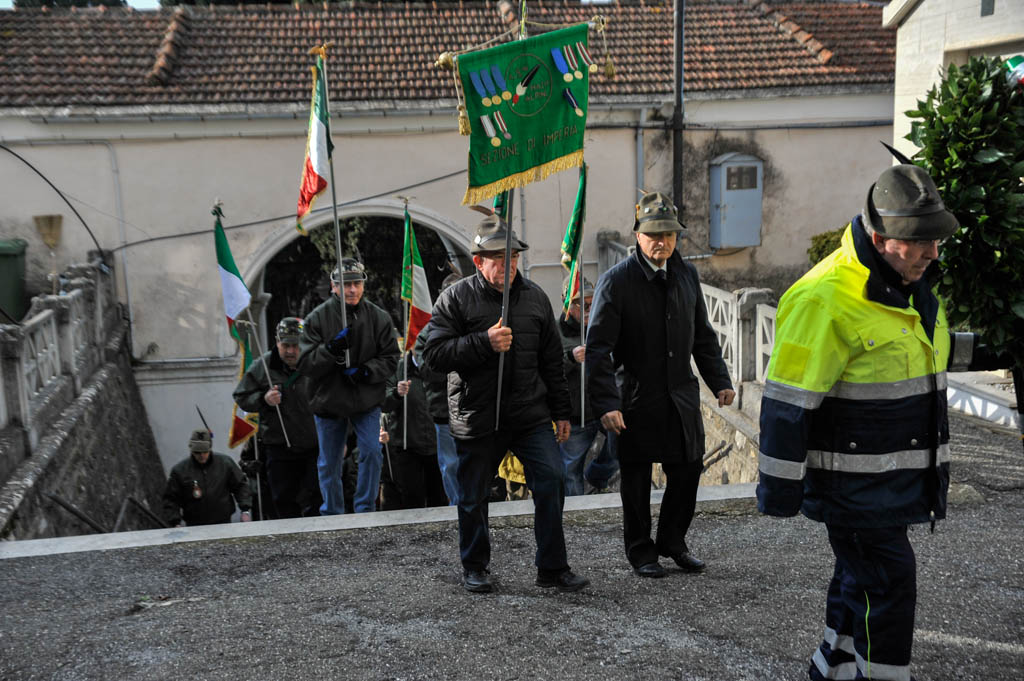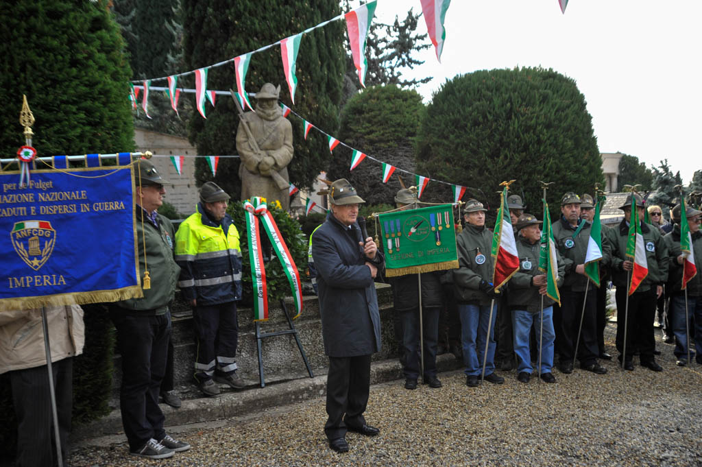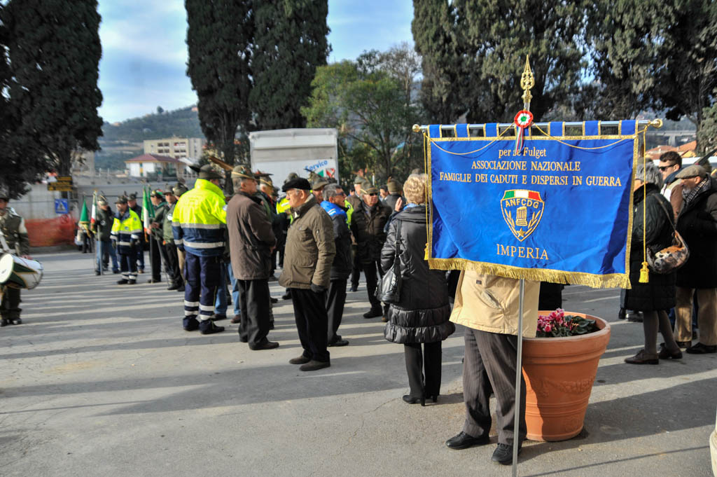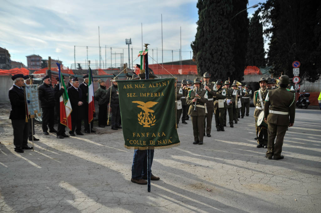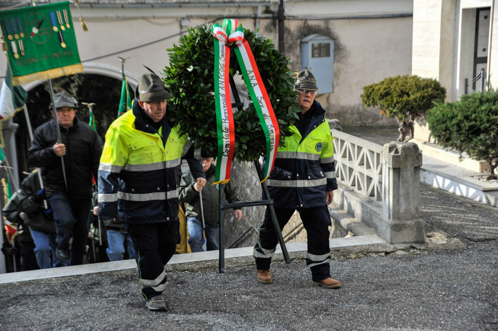 Successivamente è stata la volta della tradizionale deposizione di corone di alloro e della resa degli onori alla “Tomba Simbolica” dedicata ai Caduti e dispersi durante la campagna di Russia. A seguire ha preso la parola il Cav. Francesco Verrando, presidente del Comitato Provinciale della A.N.F.C.D.G. Di Imperia. Terminato l’intervento si è formato il corteo che ha raggiunto la chiesa Parrocchiale “Sacra Famiglia” in via Spontone, per la Santa Messa celebrata da Don Paolo Pozzoli con la partecipazione del Coro Alpino”Monte Saccarello” della Sezione A.N.A. Di Imperia e della Fanfara Alpina“Colle di Nava”.