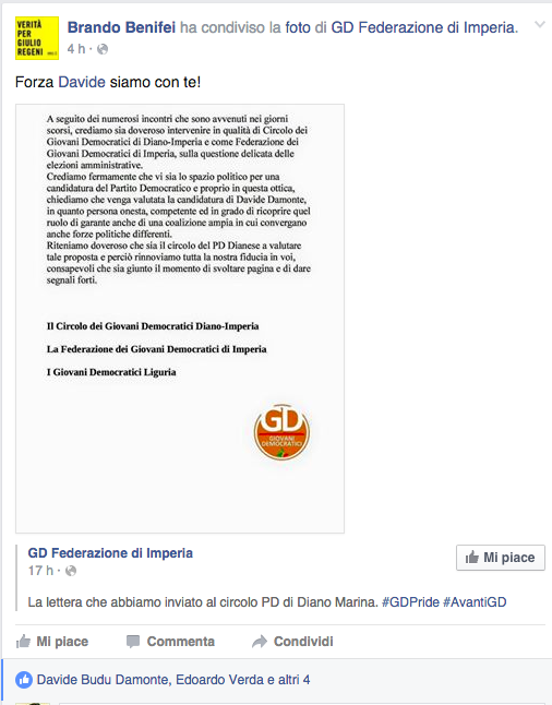 Davide Damonte sindaco di Diano Marina? È l’auspicio dell’Europarlamentare del Partito Democratico Brando Benifei che pubblicando la lettera di sostegno alla candidatura di Damonte firmata da: Circolo dei Giovani Democratici di Diano Marina, dalla Federazione dei Giovani Democratici di Imperia e dai giovani Democratici Liguria, scrive:“Forza Davide siamo con te!”. Un vero e proprio endorsement che i vertici del PD in Provincia non potranno non tenerne conto in vista della scelta del prossimo candidato sindaco anti-Chiappori.