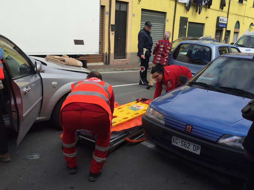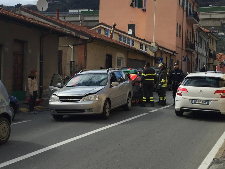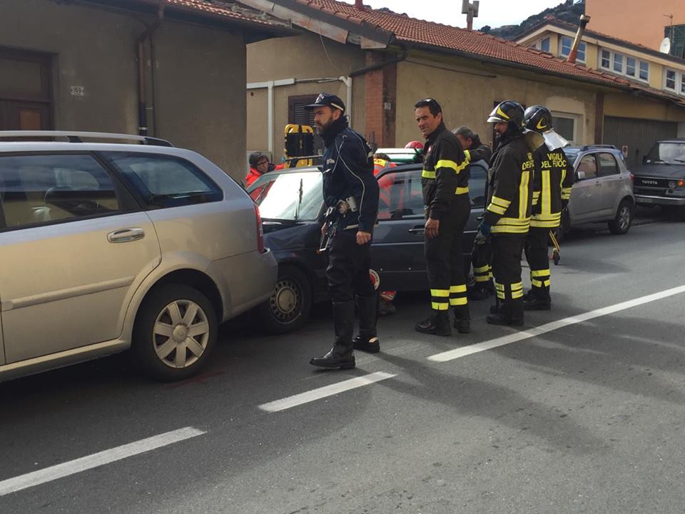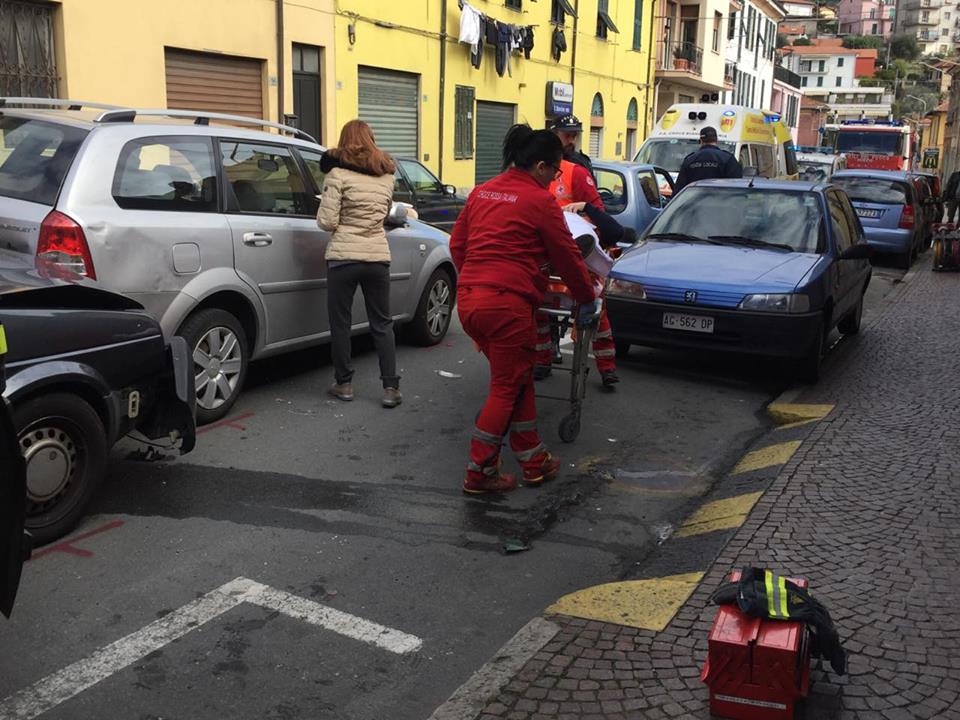 Violento tamponamento a catena nel primo pomeriggio di oggi, mercoledì 9 marzo, in via Nazionale a Castelvecchio. Tre le auto coinvolte. Nel dettaglio, per cause ancora in fase di ricostruzione, una donna di circa 50 anni, P.A., a bordo della sua Golf, proveniente da Pontedassio, ha travolto due auto incolonnate, una Chevrolet con a bordo un uomo e una donna, e una Seicento, con a bordo una coppia di anziani (alla guida C.E., di 70 anni).