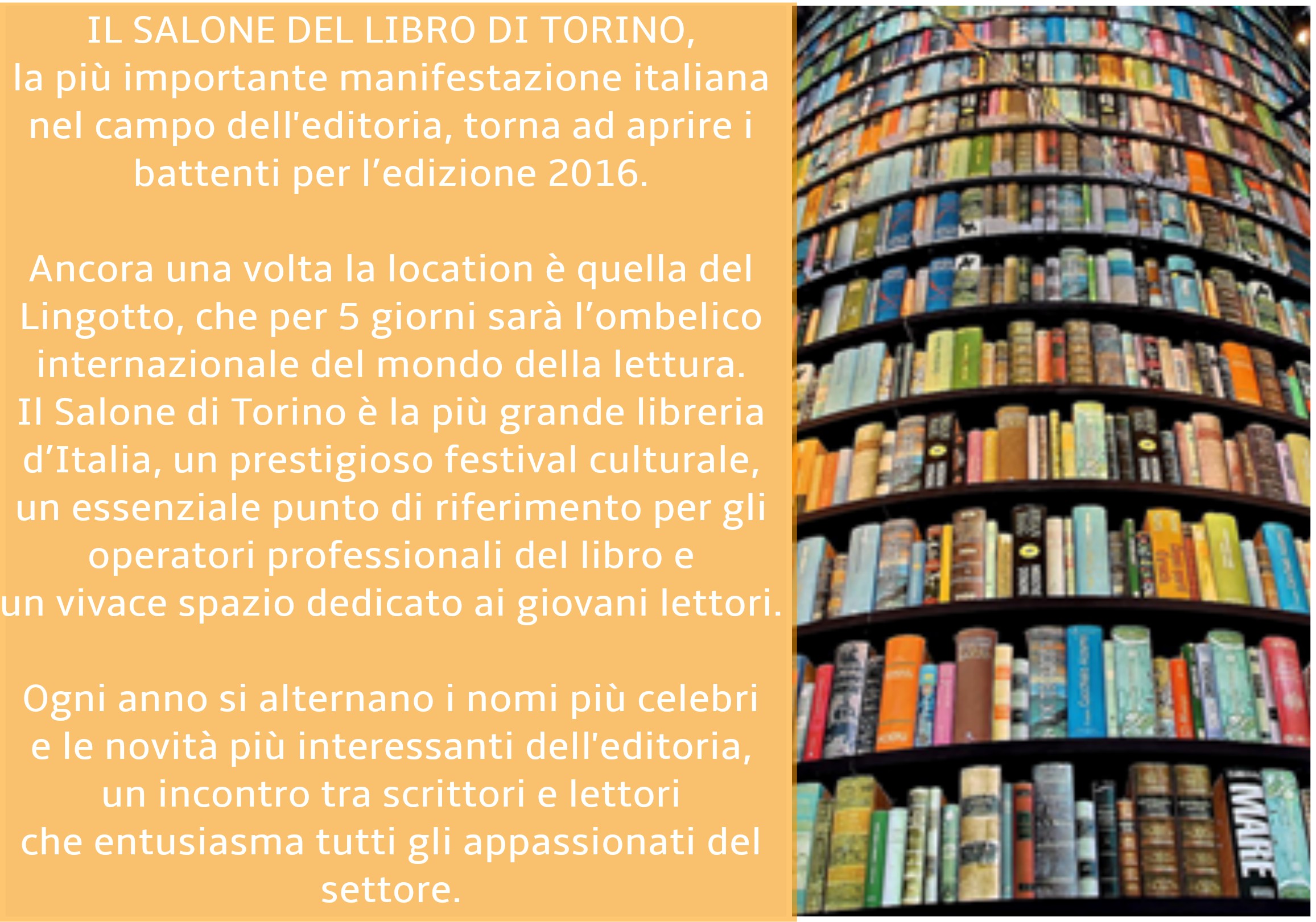Il Salone del Libro di Torino, la più importante manifestazione italiana nel campo dell’editoria, torna ad aprire i battenti per l’edizione 2016.