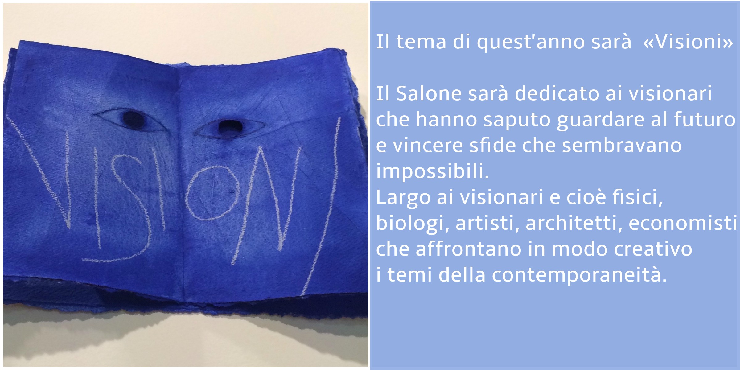 Il Salone sarà dedicato ai visionari che hanno saputo guardare al futuro e vincere sfide che sembravano impossibili. Largo ai visionari e cioè fisici, biologi, artisti, architetti, economisti che affrontano in modo creativo i temi della contemporaneità.