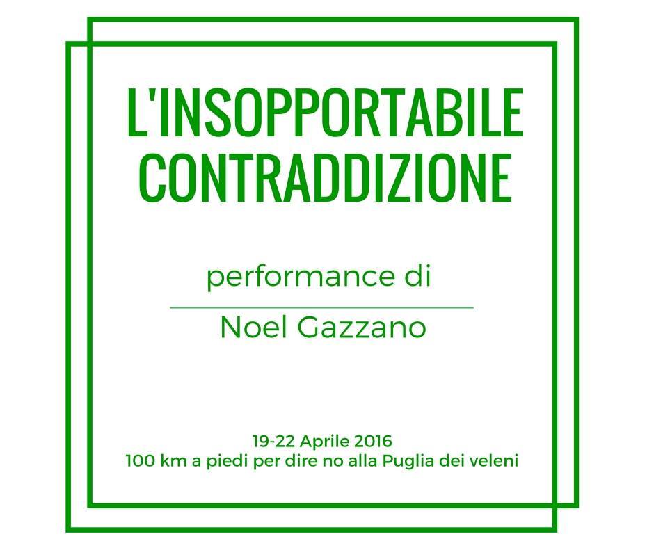 Noel Gazzano, imperiese, artista e antropologa culturale, inizierà una performance/camminata in territorio Salentino, domani, martedì 19 aprile, dal titolo “L’Insopportabile contraddizione “, partendo da Brindisi e attraversando tutto il “tacco” sino a Taranto per sensibilizzare e mettere in luce lo stretto legame e contrasto fra l’immensa bellezza esteriore e culturale del territorio in totale contraddizione con la scellerata gestione della zona, una delle più colpite dai tumori da inquinamento.