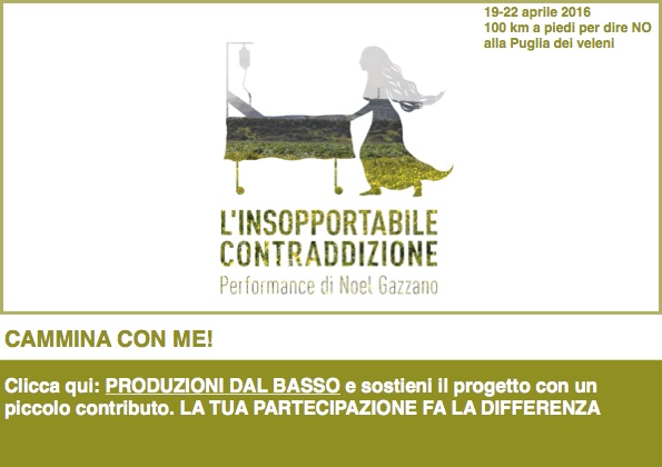 A sostegno del progetto è stata lanciata una campagna crowdfunding sulla piattaforma Produzioni dal Basso che mira a realizzare una mostra itinerante con il materiale fotografico e video raccolto durante la performance.(https://www.produzionidalbasso.com/project/linsopportabile-contraddizione-performance-100km-a-piedi-per-dire-no-alla-puglia-dei-veleni/)
