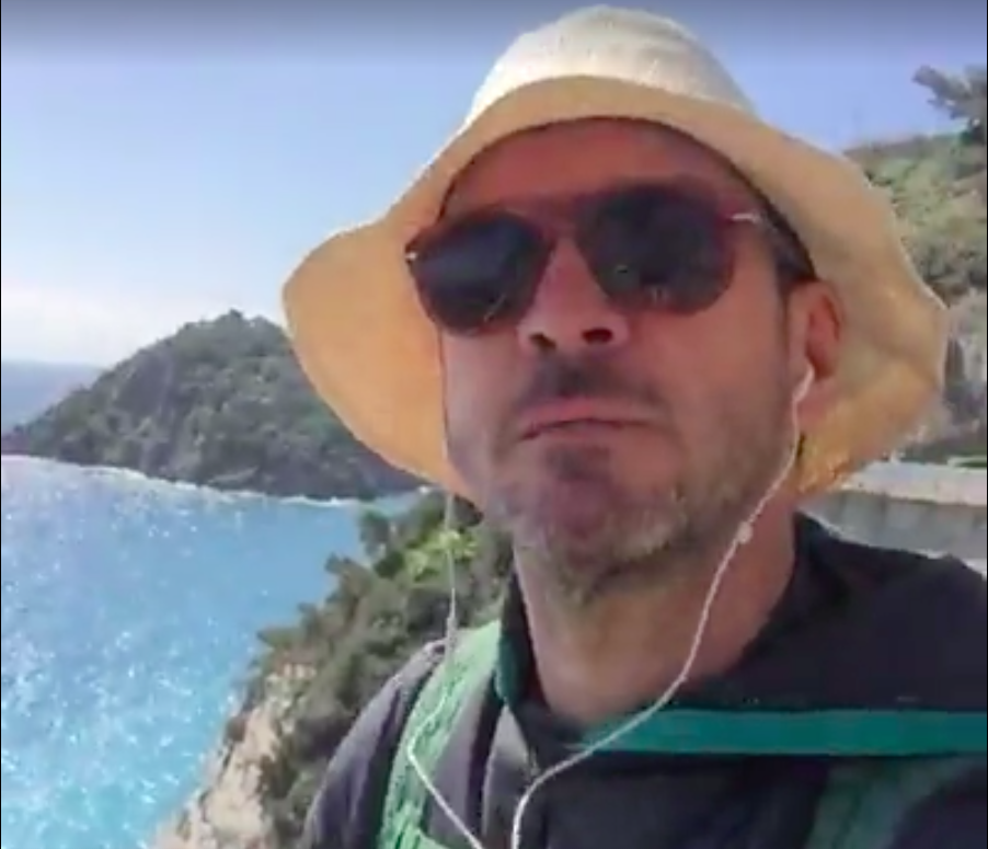 Questa notte dormirà ad Albissola Marina e domattina proseguirà nell’entroterra Savonese, per lasciare il mare ha filmato i propri piedi ristorati dall’acqua e dalle onde.