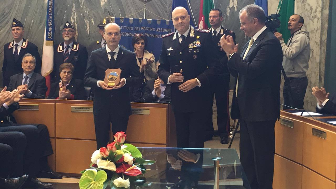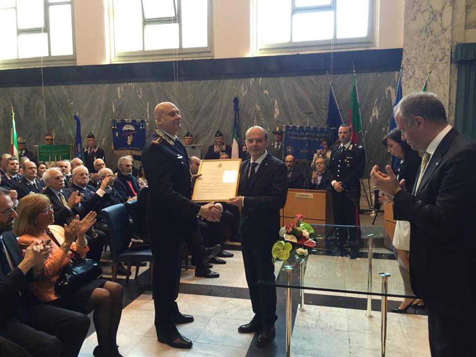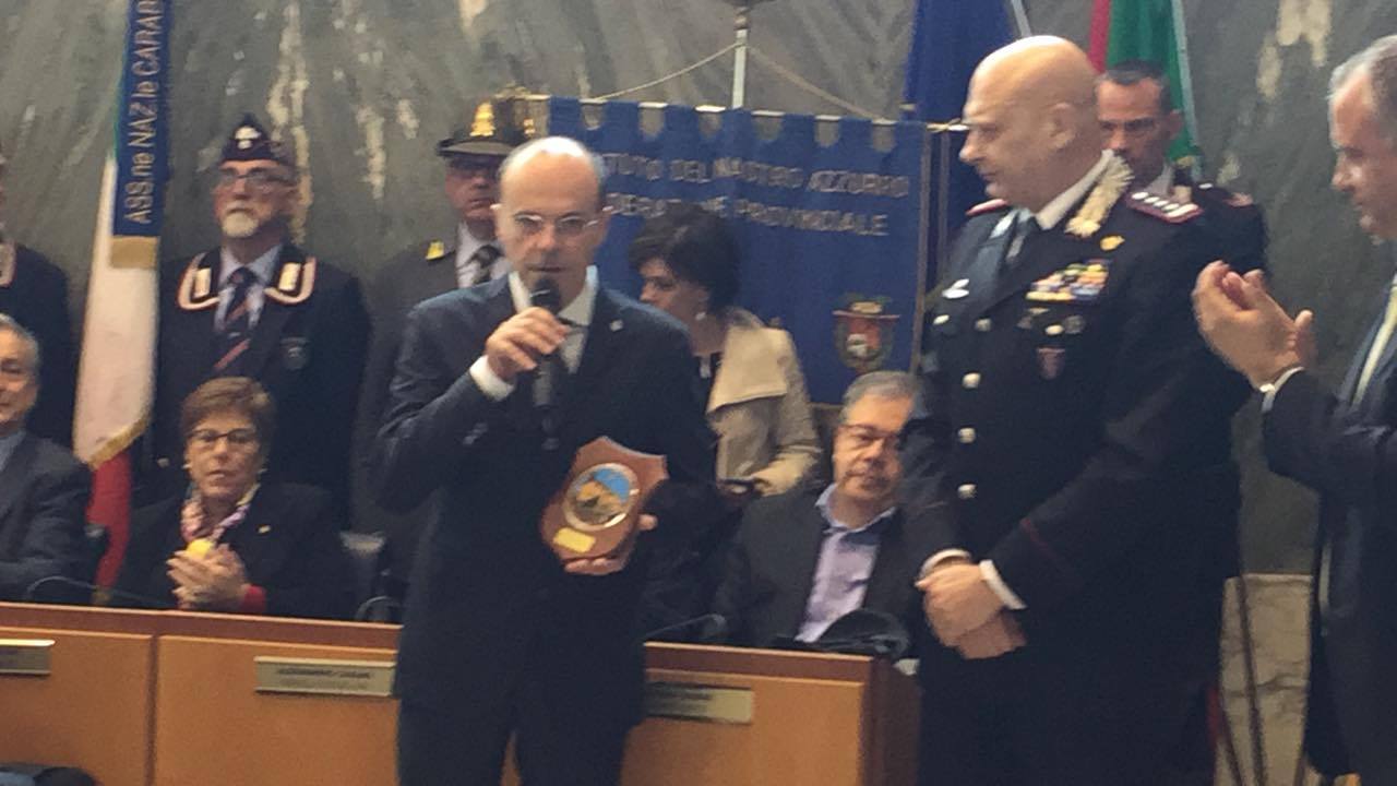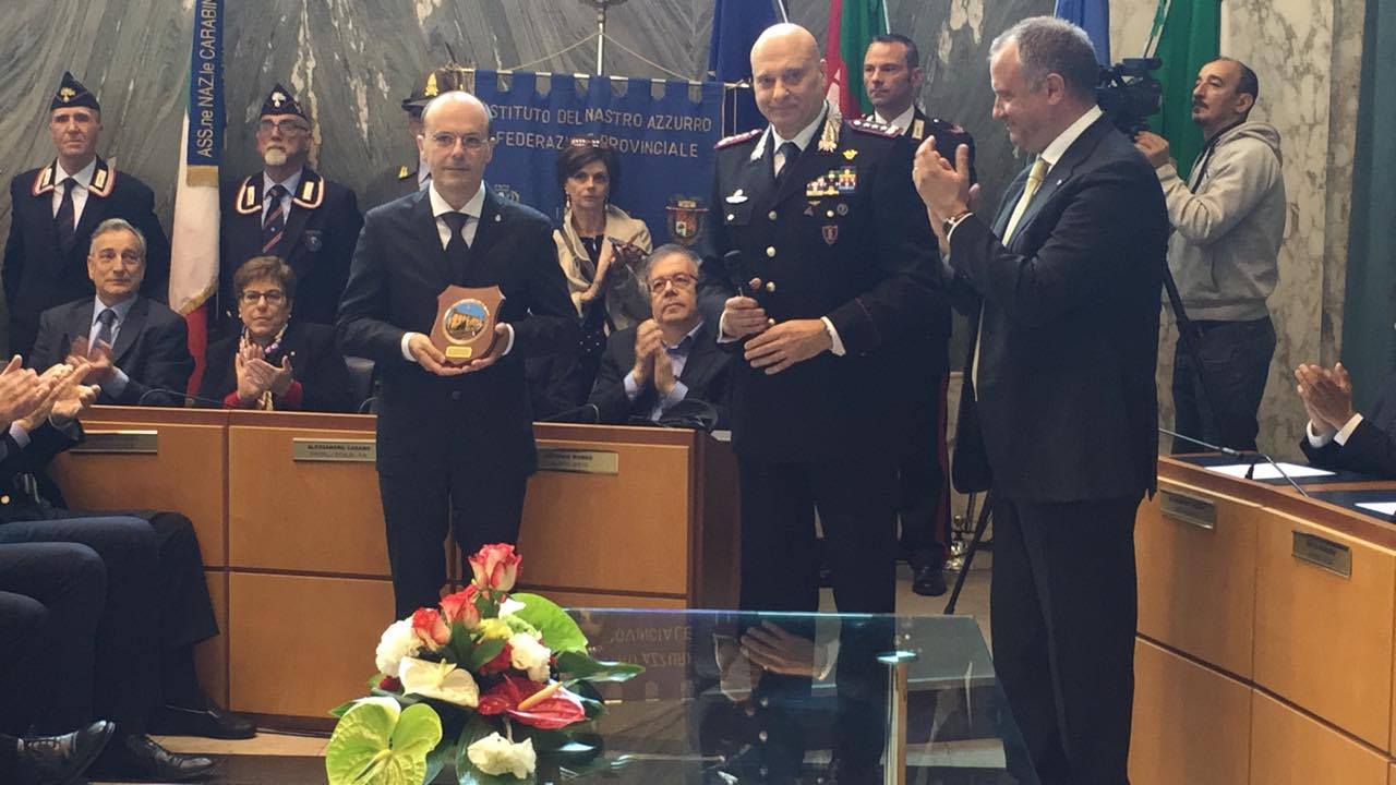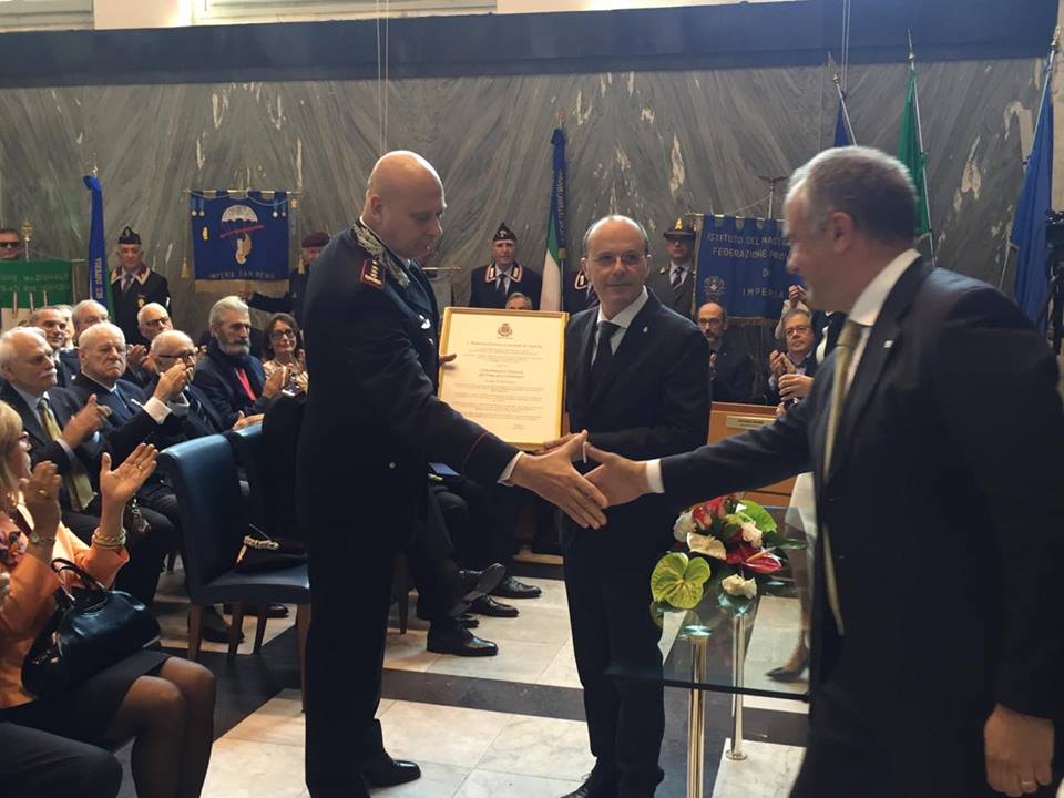 Io sento di poter dire, non solo a nome mio in quanto responsabile del nord ovest, ma a nome dei colleghi che rappresentano un ramo sul territorio che il nostro impegno non solo continuerà ma cercheremo di migliorarlo, di portarlo sempre più avanti con il concorso necessario di tutte le istituzioni che ci hanno sempre accompagnato e continueranno a farlo, con il concorso dei colleghi di altre forze di Polizia e di sicurezza, ai quali ovviamente va anche il mio ringraziamento per quello che fanno assieme a noi, ci impegneremo sempre di più. Sono certo che i risultati ottenuti siano risultati di buon livello, ma sono altrettanto certo che potremmo continuare a fare ancora molto e a farlo sempre di più. Quindi grazie signor Sindaco, grazie presidente, grazie a tutte le autorità. Sappiate che con questo vostro attestato, con questa vostra stima, ci spronate a fare sempre molto di più, grazie. È stato ricordato che sono 80 anni che l’arma occupa la stessa Caserma di Imperia, bella tra l’altro, molto bella e per questa ragione il Comando Provinciale dei Carabinieri lascia al sindaco e al comune di Imperia un “Crest” che vuole ricordare gli 80 anni di presenza nella città di Imperia”.