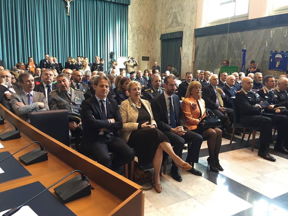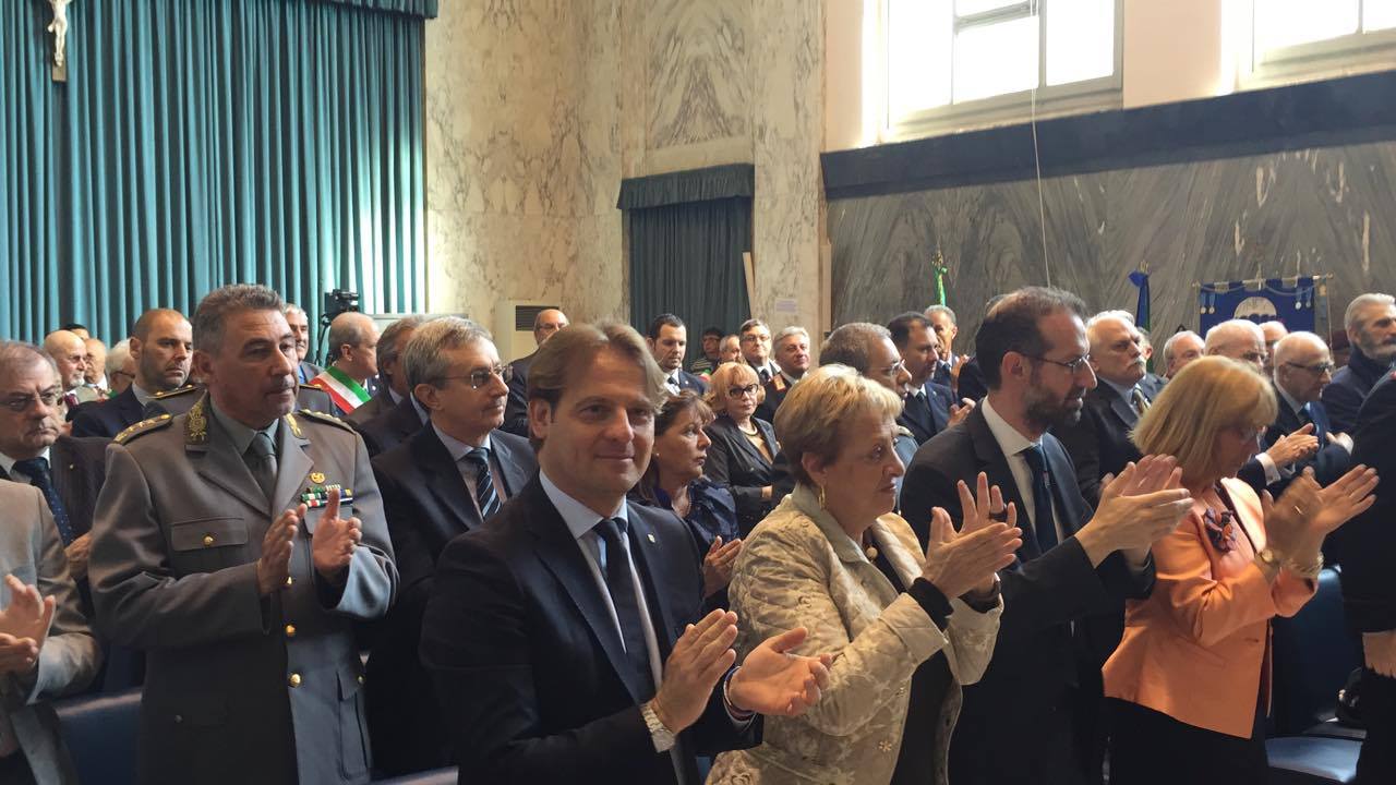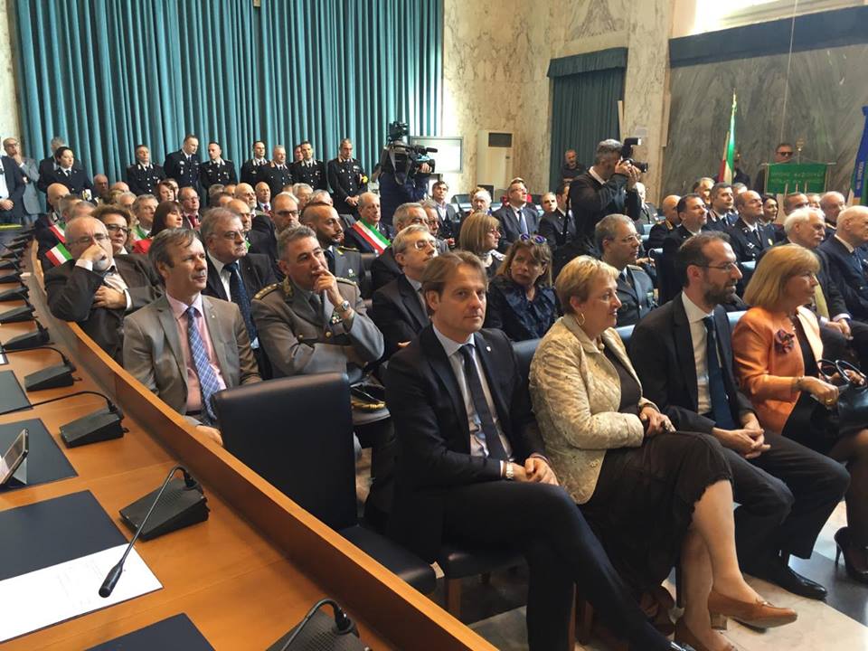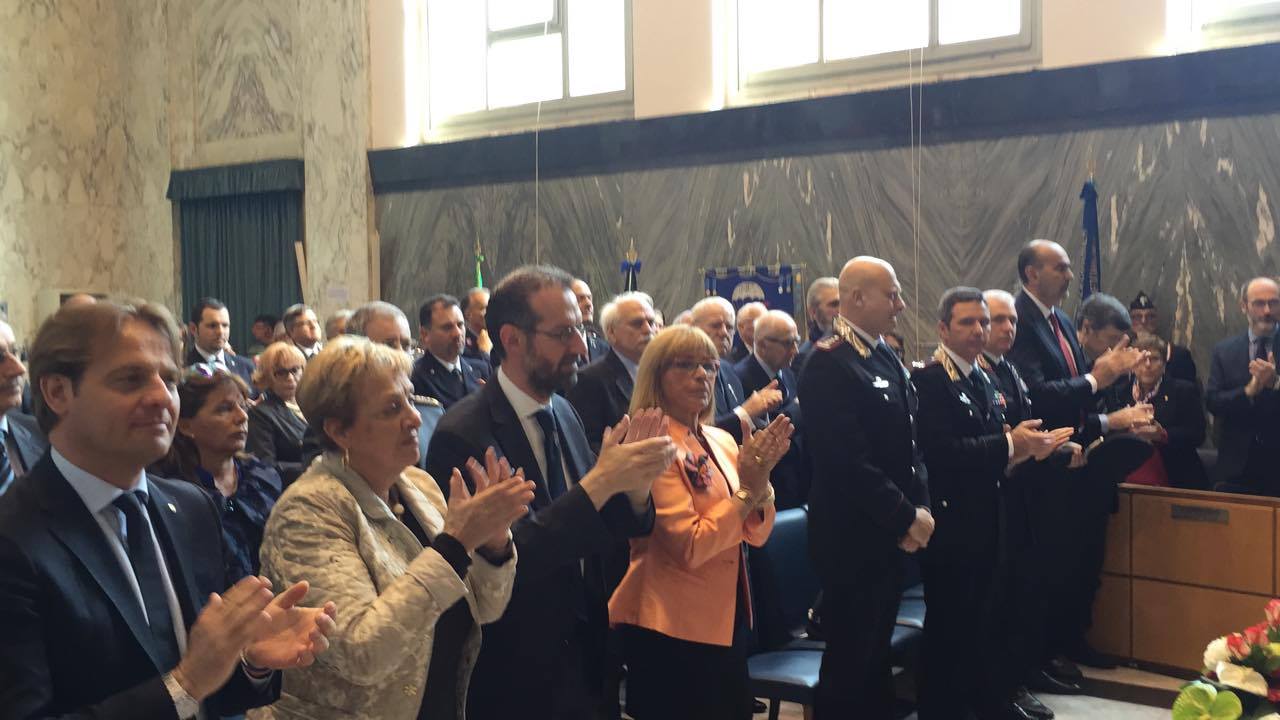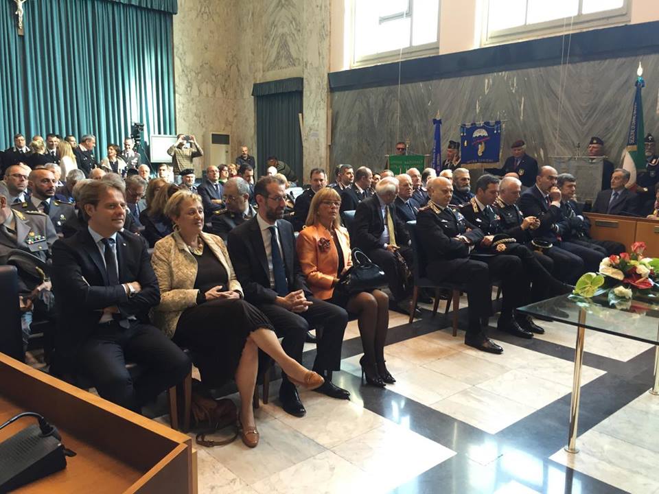 “Signor sindaco, presidente del consiglio Parodi, Consiglio Comunale tutto, autorità, colleghi delle forze di polizia nazionali e della Gendarmeria, grazie. Io vi porto il ringraziamento del Comandante Generale Tullio Del Sette impegnato per altre ragioni a Roma, non poteva partecipare, ma io sono orgoglioso di aver preso il suo posto e ne sono onorato.
