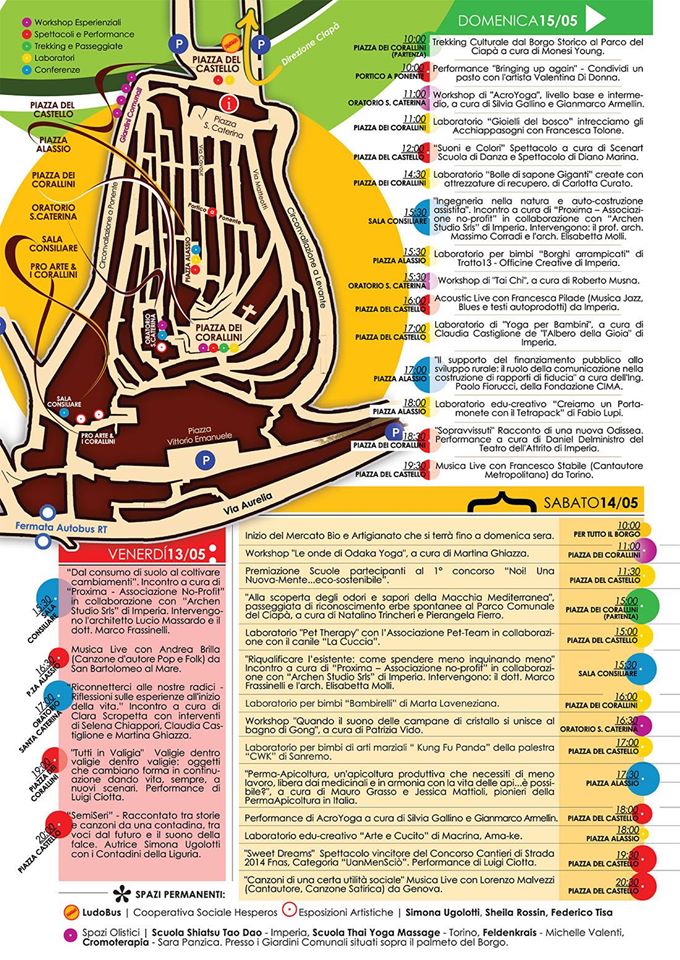 Saranno infatti moltissime le occasioni di confronto per il pubblico che parteciperà a NuovaMente 2016. Lungo i caratteristici caruggi del borgo si terranno il Mercato del Naturale e del Biologico a km 0, con prodotti alimentari sostenibili, tra cui frutta e verdura, olio, conserve e birra artigianale ed il Mercatino dell’Artigianato e del Riciclo Creativo. Mostre d’arte ed esposizioni dedicate all’ascetismo, fotografia e ad una collezione di disegni dedicati ai borghi italiani, saranno allestite negli spazi dell’Oratorio di Santa Caterina, ProArte e Circolo Marinaresco i Corallini, mentre i giardini di Circonvallazione a Ponente ospiteranno uno spazio olistico dedicato al wellness psicofisico.
