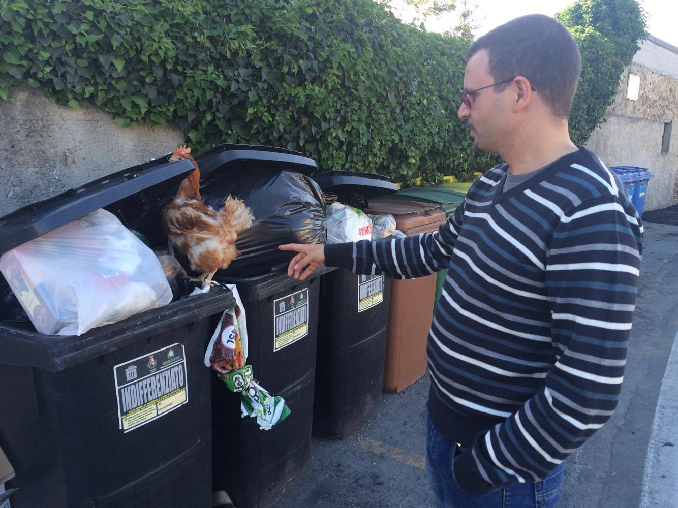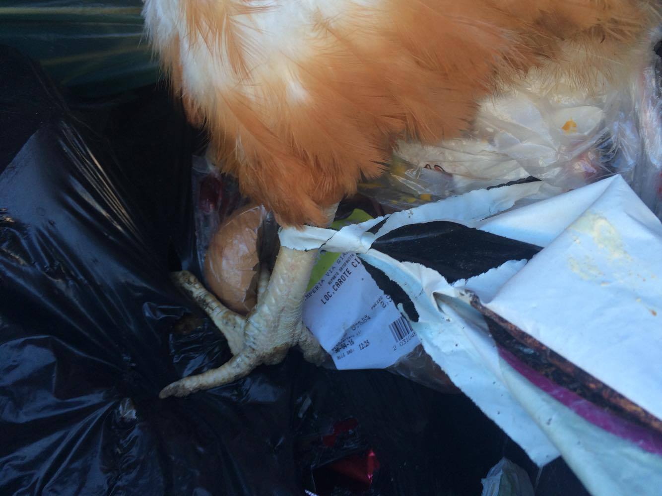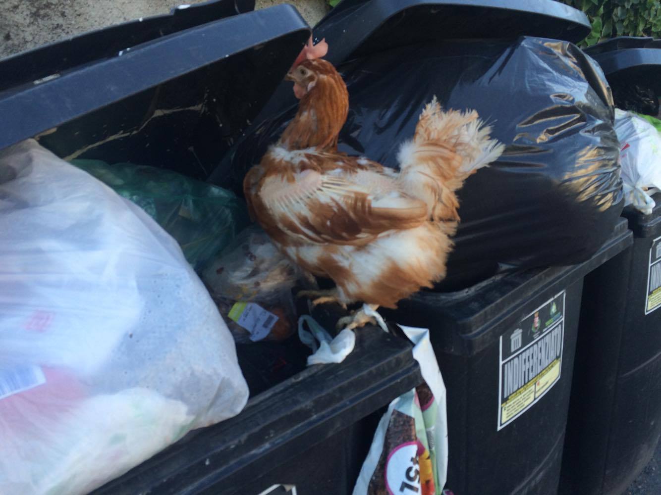Una gallina viva chiusa in un sacchetto di plastica gettata nel bidone dei rifiuti indifferenziati. Una scoperta che ha dell’incredibile, quella fatta dal nostro lettore Cristian, questo pomeriggio presso una delle isole ecologiche di via Giuseppe Airenti a Porto Maurizio. L’uomo, quando si è avvicinato al bidone, ha notato che da un sacchetto semiaperto spuntavano delle piume decidendo così di aprilo e scoprendo che al suo interno c’era una gallina, viva e vegeta, che sarebbe morta sicuramente morta soffocata o schiacciata in poche ore.