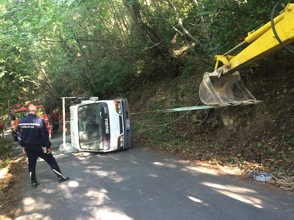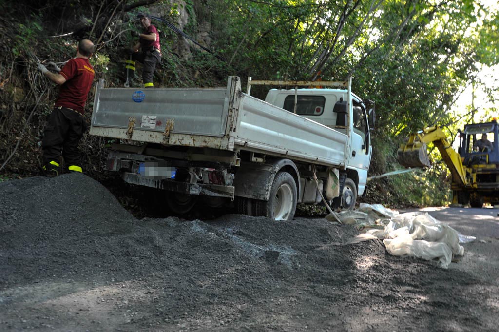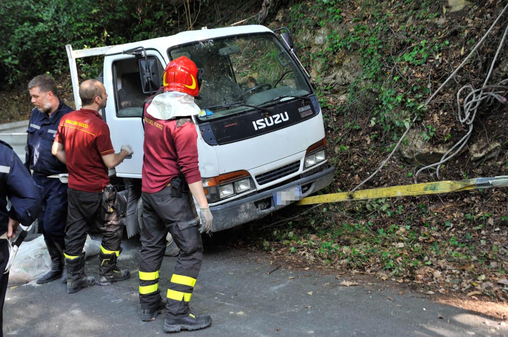 E’ stato necessario l’intervento di una ruspa per bloccare il camioncino che, vista la pendenza della strada, rischiava di scivolare a valle. I Vigli del Fuoco hanno agganciato una carrucola a un albero per poi, con l’ausilio dell’argano della jeep, raddrizzare il camioncino. Illeso per fortuna il conducente.
