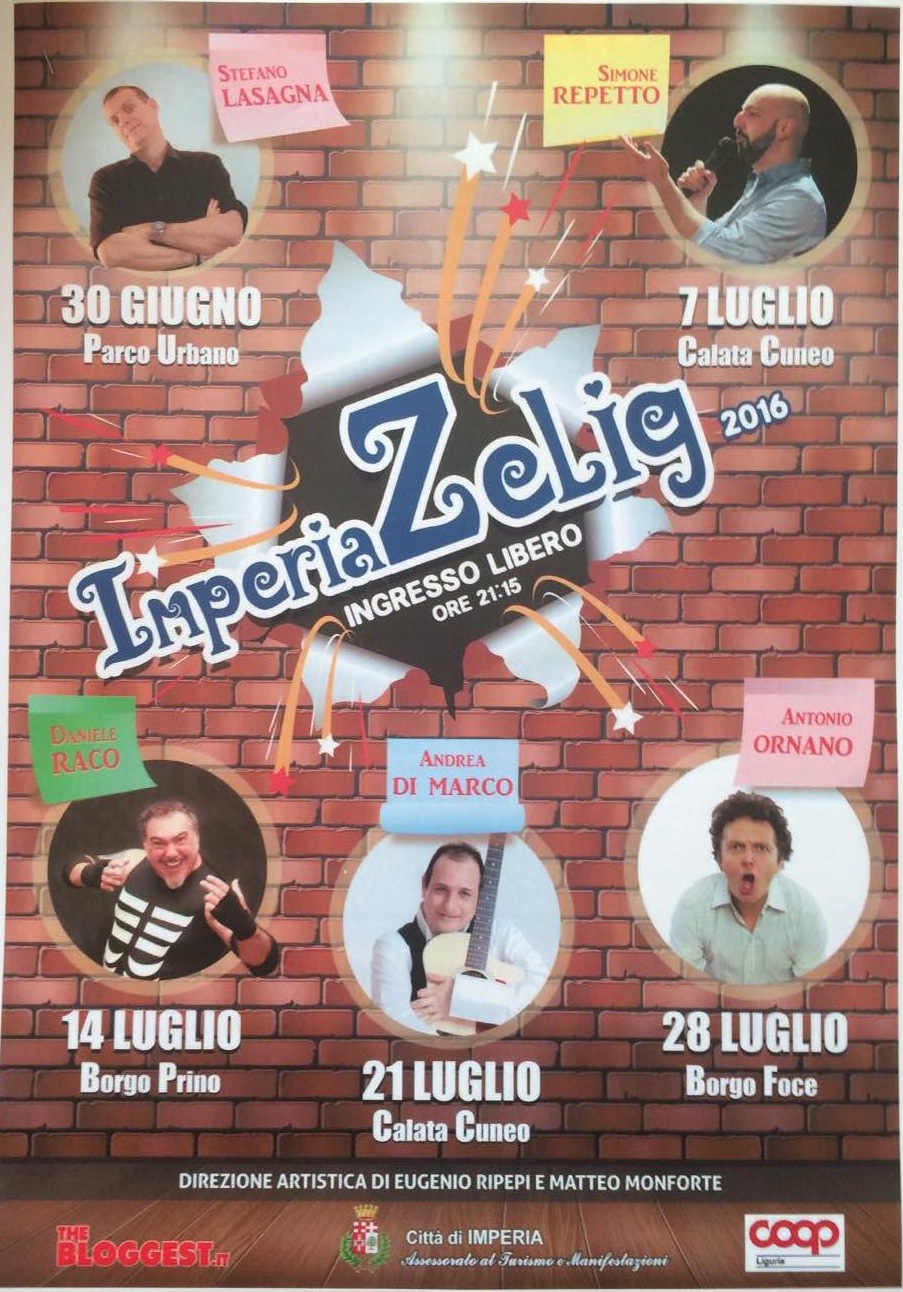 Imperia. Presentata questa mattina in Comune la prima edizione di “ImperiaZelig”! Il festival della comicità, sulle orme di “RiDiano” della città degli aranci, si è trasferita nel capoluogo. Ideato da Eugenio Ripepi, in base alle sue recenti frequentazioni in qualità di performante dello storico locale Zelig milanese in viale Monza, ImperiaZelig si articola in cinque giovedì di spettacolo, voluti fortemente dall’Assessore alle Manifestazioni Simone Vassallo tutti in posti differenti della città, punti nevralgici dell’attenzione di Oneglia e Porto Maurizio: Parco urbano, Calata Cuneo, Borgo Foce e Borgo Prino. La direzione artistica è di Eugenio Ripepi e Matteo Monforte. Matteo Monforte, genovese, autore di Zelig dal 2009, ha prodotto testi per i più famosi comici italiani. Scrive per la tv, la radio e il teatro. Ha pubblicato “Prendo la sciarpa e arrivo da te” (Indies G&A); “Come siamo caduti in basso, Oscar” (Chinaski); “La Genova male” (Chinaski); “Cenere” con Marco Rinaldi e Lazzaro Calcagno (Erga).