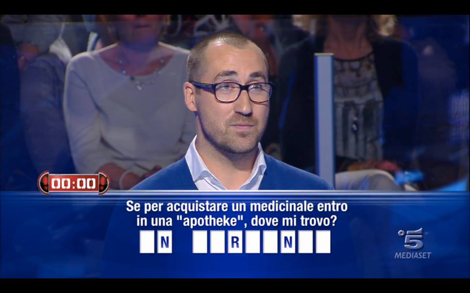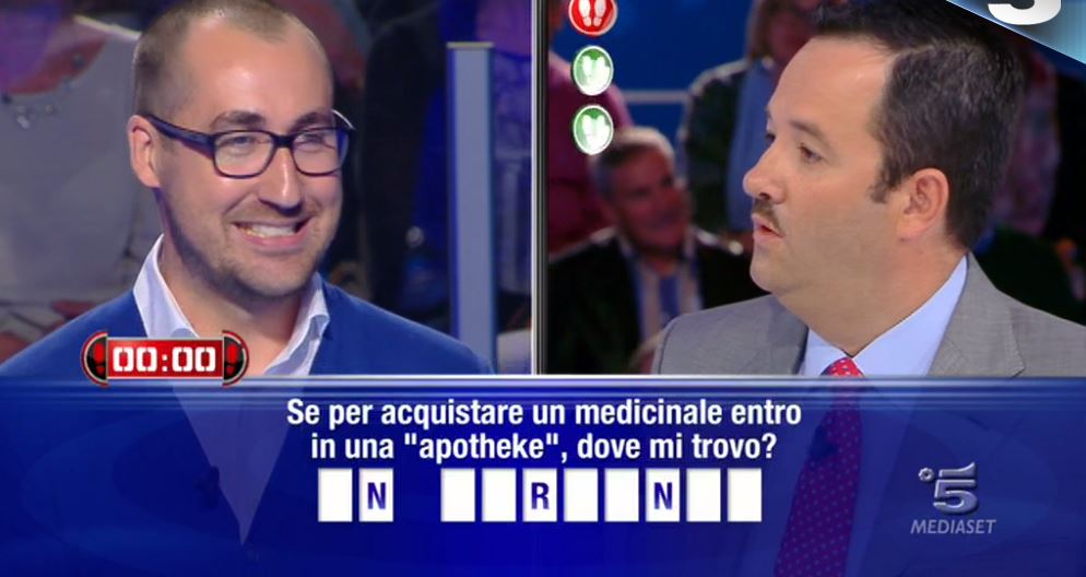 Dopo aver risolto brillantemente i primi enigmi, Marco non è riuscito a rispondere correttamente alla domanda “se per acquistare un medicinale entro in una “Apotheke”, dove mi trovo?”. La risposta esatta era Germania. Un errore che è costato a Marco l’eliminazione, nonostante l’ottima prova.