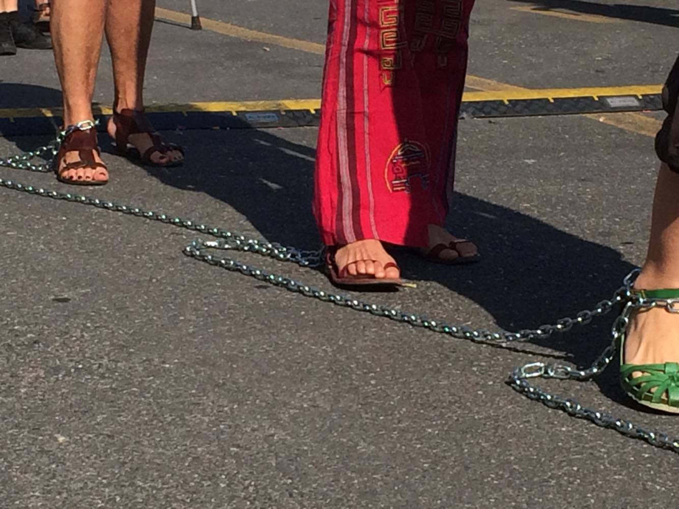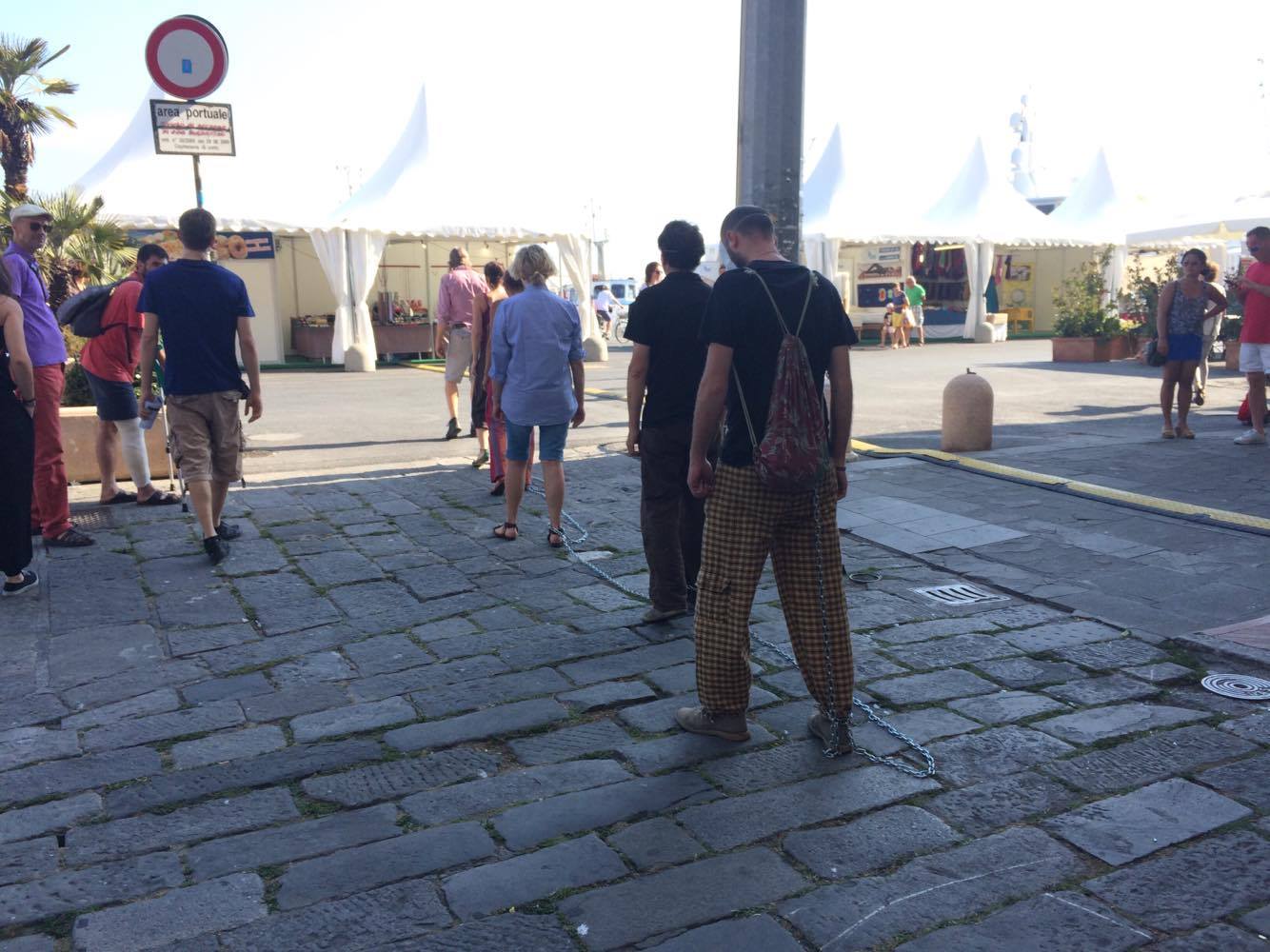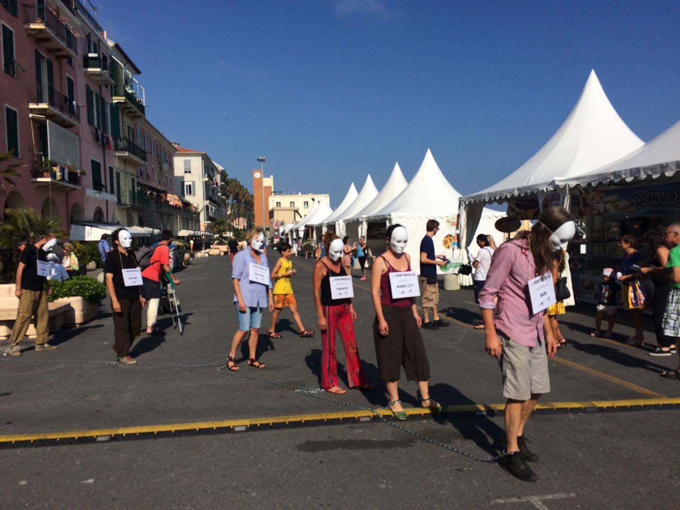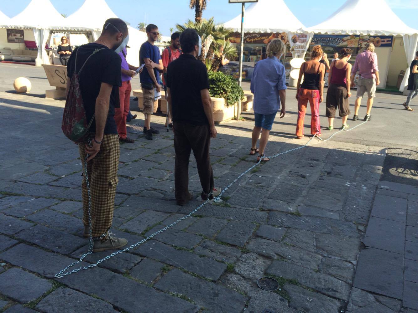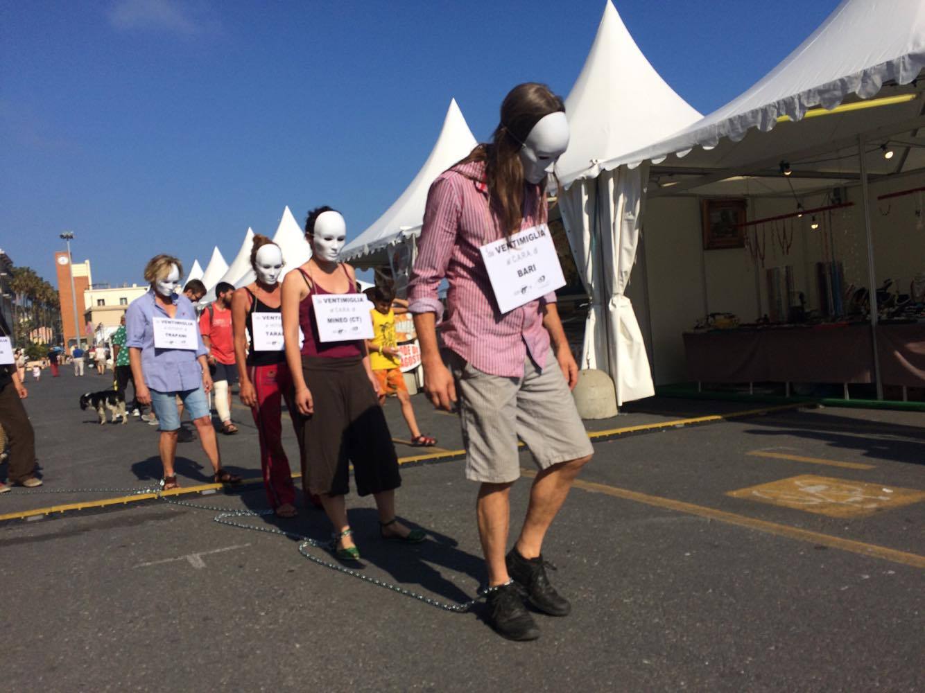 Catene ai piedi, in silenzio, in fila indiana, con il viso coperto con una maschera e un cartello appeso al collo, con sopra indicata una destinazione. Si sono presentati così, questo pomeriggio, tra le bancarelle di San Giovanni, davanti ai passanti, in Calata Cuneo, una decina di attivisti.