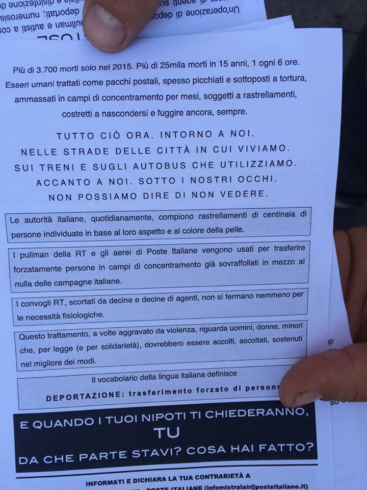 “I pullman della Rt e gli aerei di Poste Italiane vengono usati per trasferire forzatamente persone in campi di concentramento già sovraffollati in mezzo al nulla delle campagne italiane”.