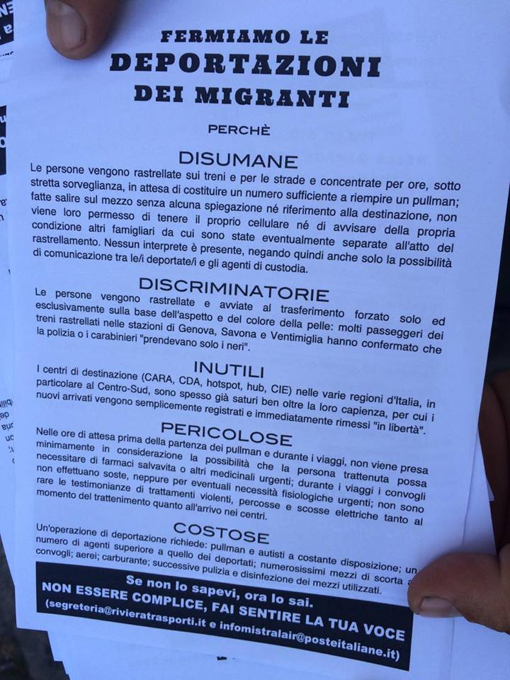 “Fermiamo le deportazioni dei migranti perché disumane, discriminatorie, inutili, pericolose, costose. Se non lo sapevi, ora lo sai. Non essere complice, fai sentire la tua voce”.