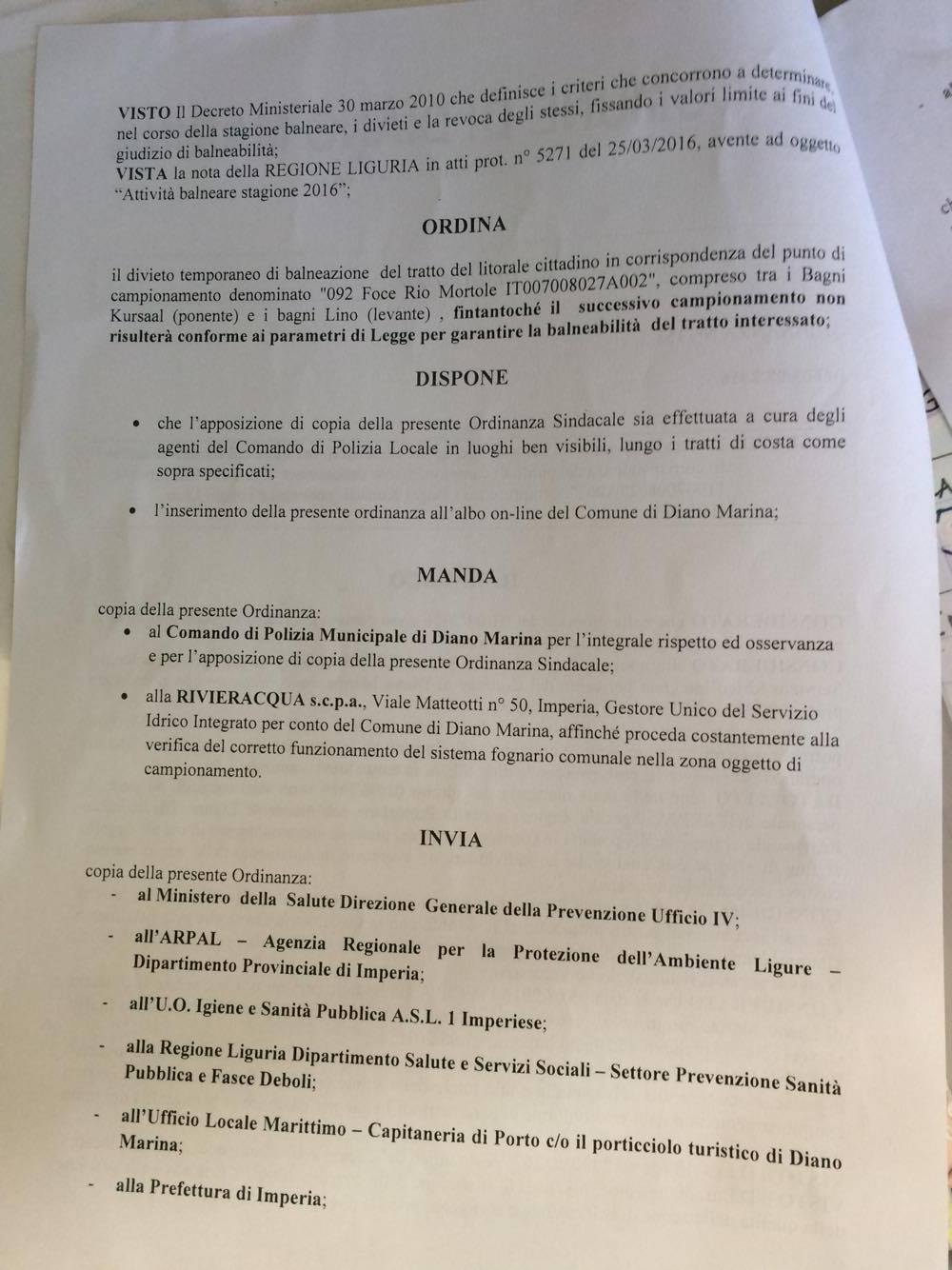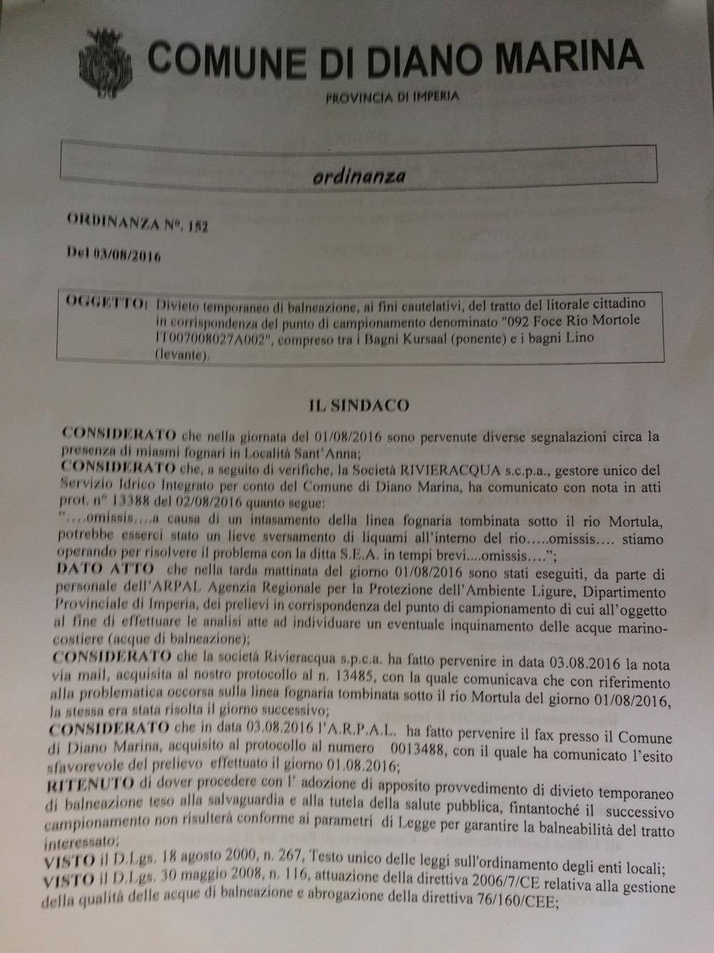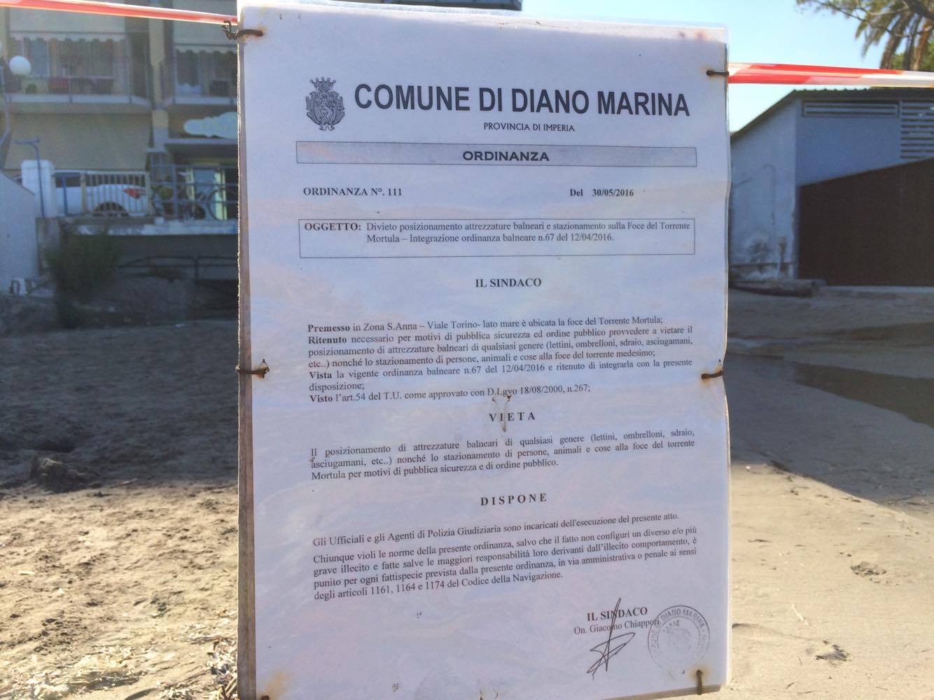 Scatta il divieto preventivo di balneazione a Diano Marina per dei valori dell’acqua superiori al limite consentito dalla Legge. Il sindaco Chiappori ha emesso il divieto di balneazione nel tratto di mare che comprende i bagni “Lino”, “Kursaal” ed “Elena” per un tratto di circa 200 metri dalla foce del Rio Mortula già in passato oggetto di polemiche e di sversamenti di liquami in mare.