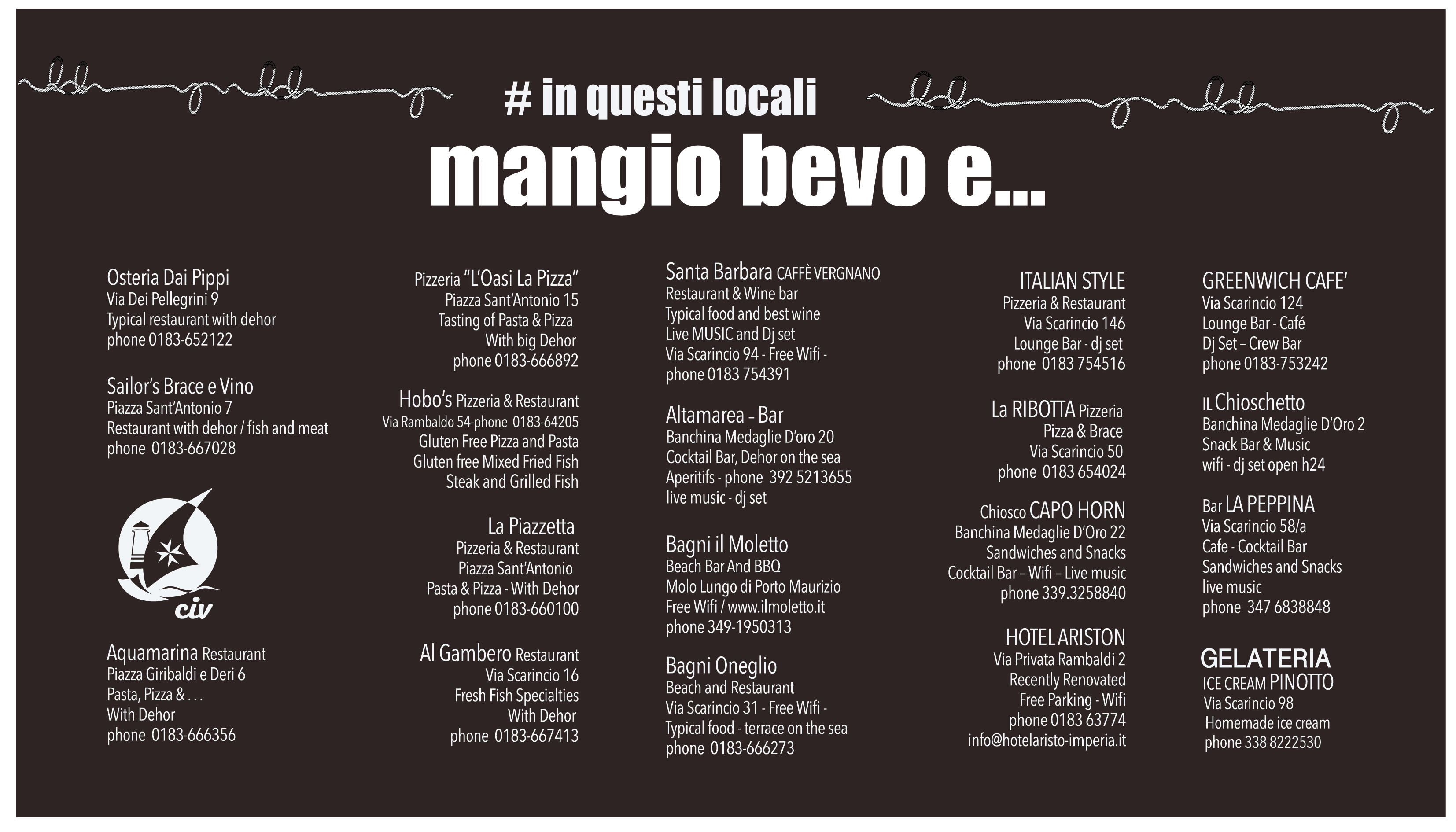 Il civ ringrazia l’amministrazione comunale , la confesercenti , il consorzio degli stabilimenti balneari e tutte le aziende che sostengono il calendario manifestazioni. Ricordiamo infine che tutti gli eventi sono patrocinati dalla Camera di Commercio e dalla Regione Liguria .