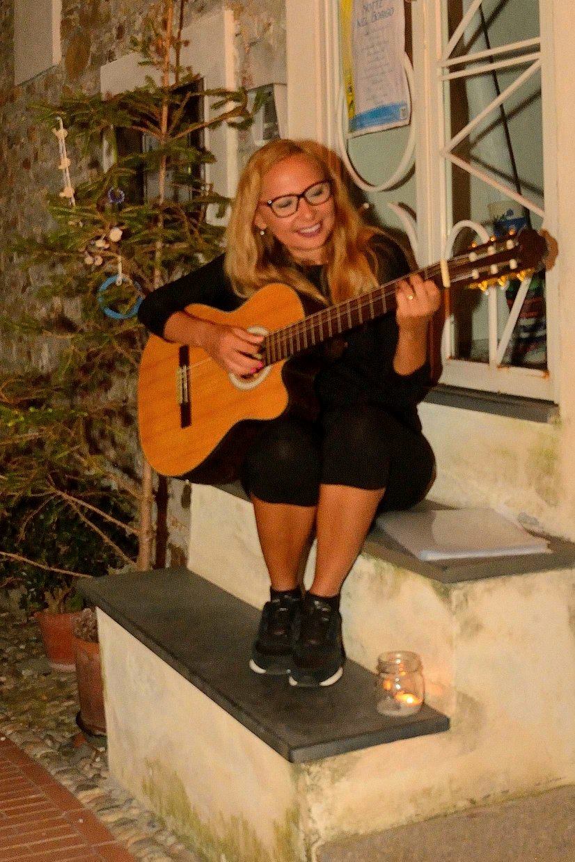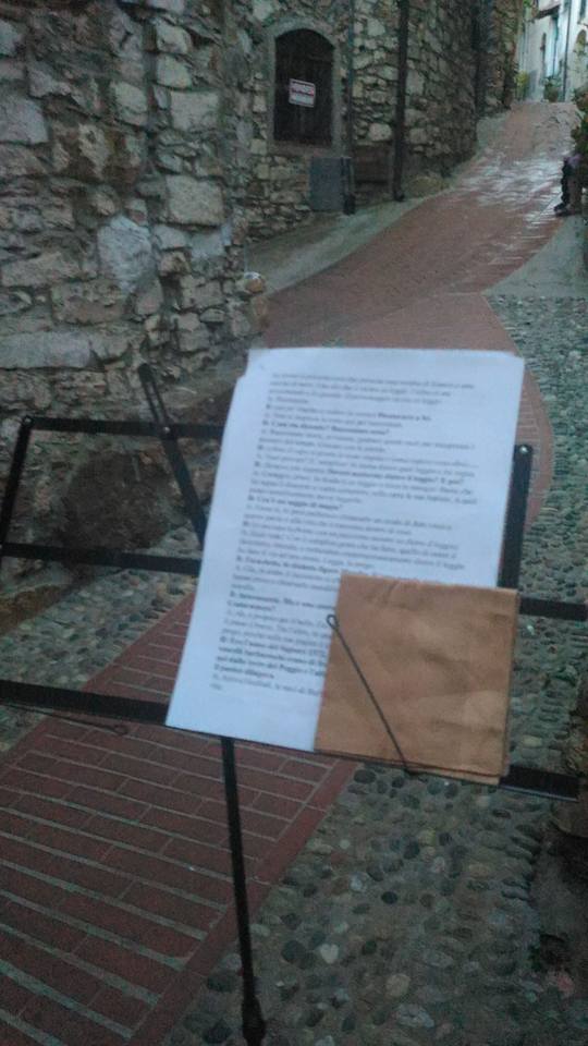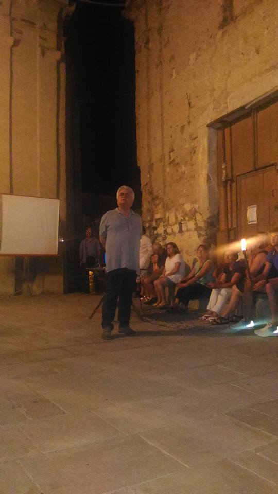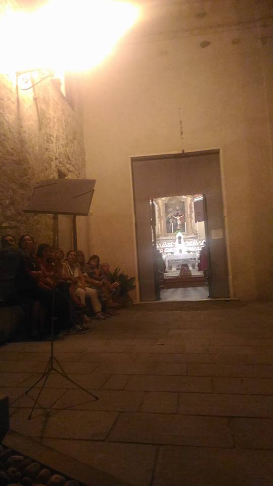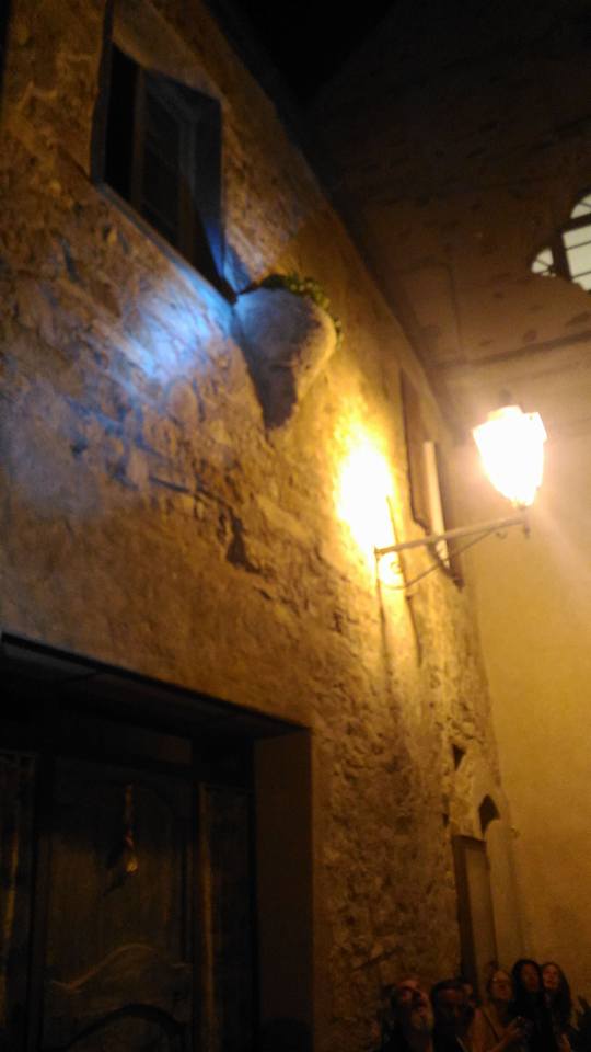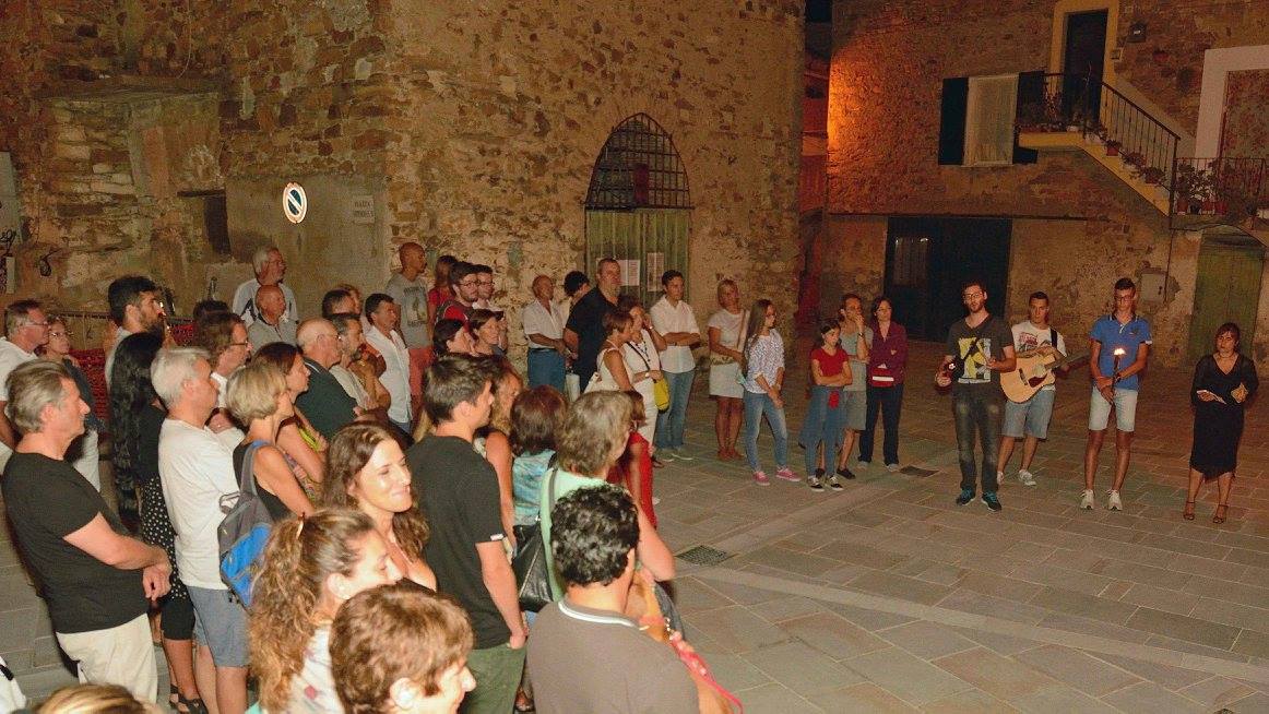 La passeggiata è proseguita in via Sant’Antonio, guidata da Stefano e costantemente accompagnata dagli arpeggi di Davide, che hanno condotto il gruppo alla quarta postazione, dove si è potuto ascoltare un inedito dialogo sui Saraceni, scritto da Franco e recitato da Cinzia ed Alessandro, che conteneva il messaggio: “Le pietre ci parlano se sappiamo interrogarle con curiosità!”
