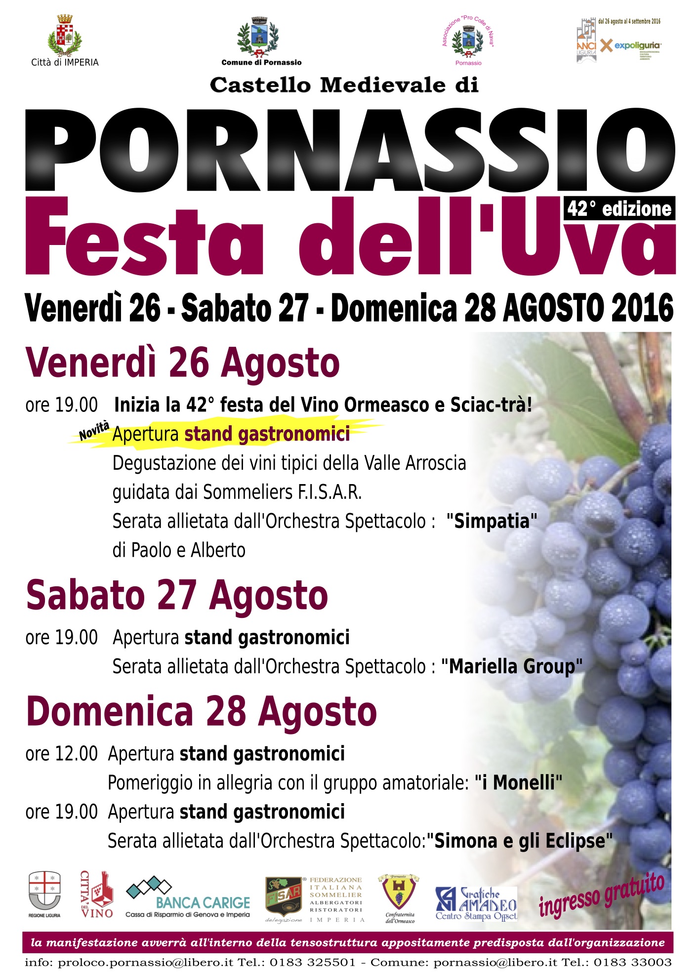 Inizierà venerdì 26 agosto la 42° “Festa dell’Uva” e “Rassegna dei vini tipici dell’Alta Valle Arroscia” al Castello Medioevale di Pornassio e proseguirà sino a Domenica 28 Agosto 2016