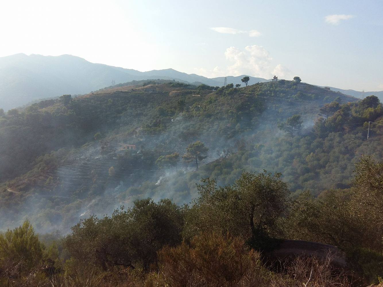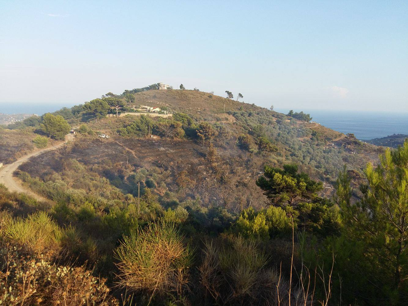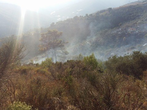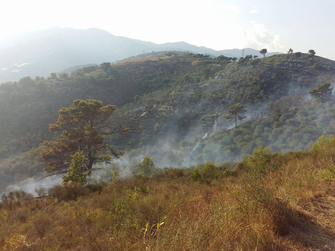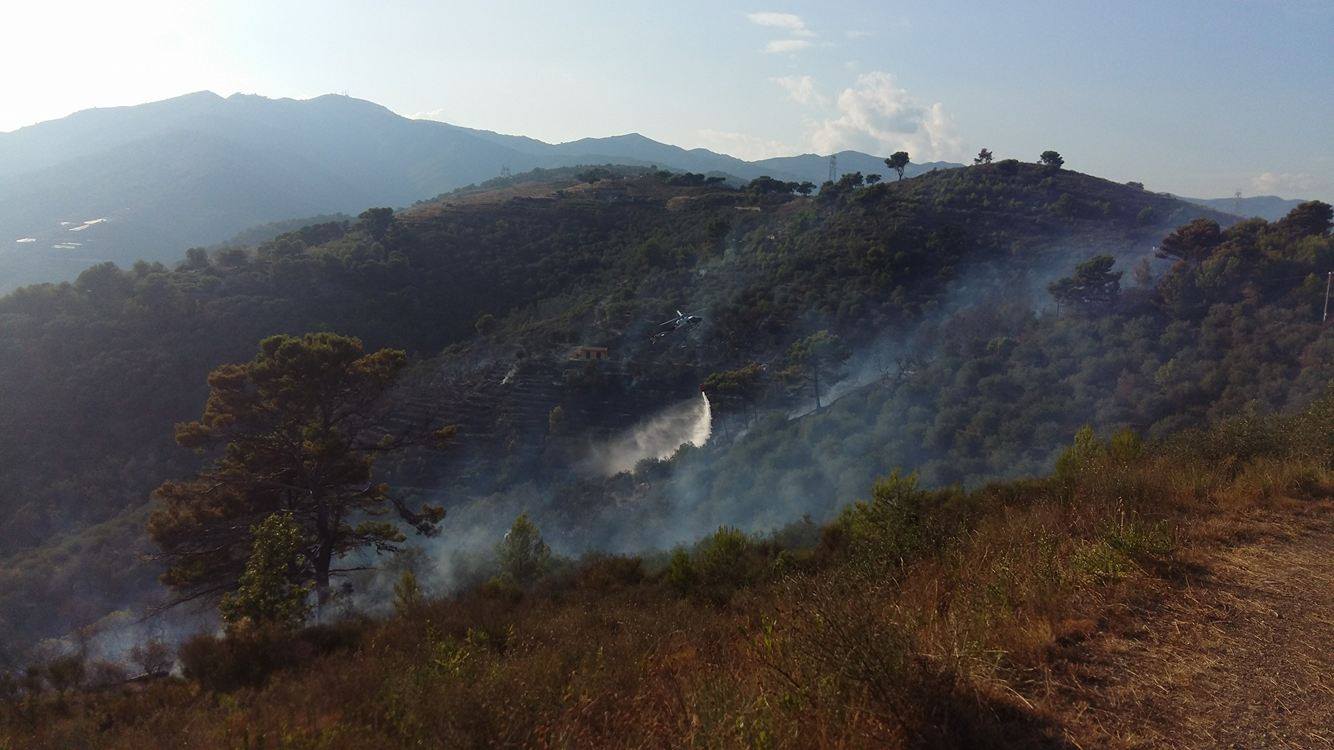 Imperia. Giornata calda sul fronte incendi per la protezione civile e per il corpo forestale dello Stato che da questo pomeriggio stanno lavorando per domare un vasto incendio che ha interessato località “5 Burche” subito sopra a Civezza.