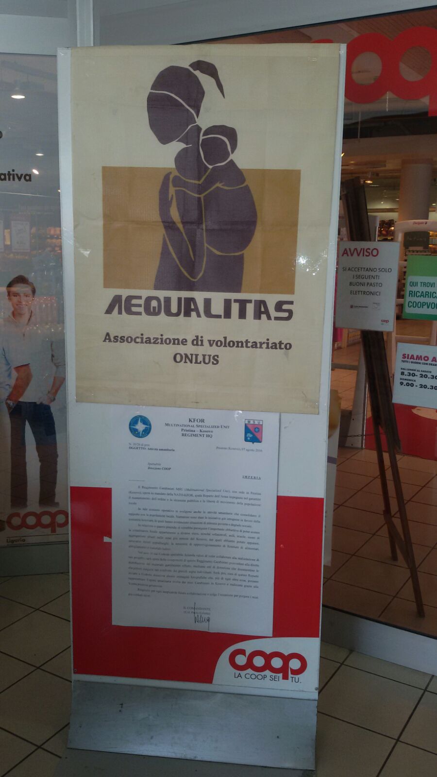 Il nostro ringraziamento va, inoltre, al direttore ed ai dipendenti della Coop imperiese, per la disponibilità e la collaborazione, permettendoci così di essere vicini ai nostri militari in missione di pace nel mondo.