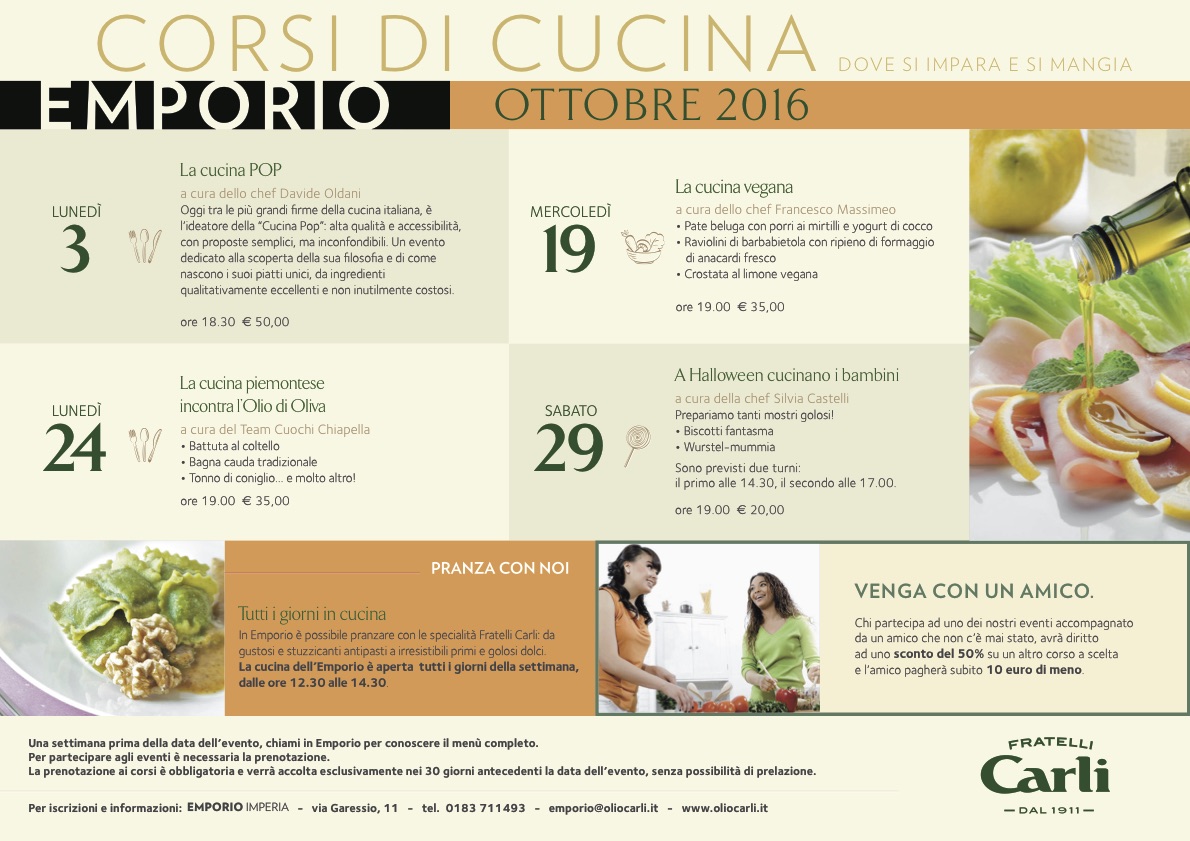 Per iscrizioni e informazioni: EMPORIO FRATELLI CARLI – via Garessio, 11 – tel. 0183 711493 – emporio@oliocarli.it – www.oliocarli.it