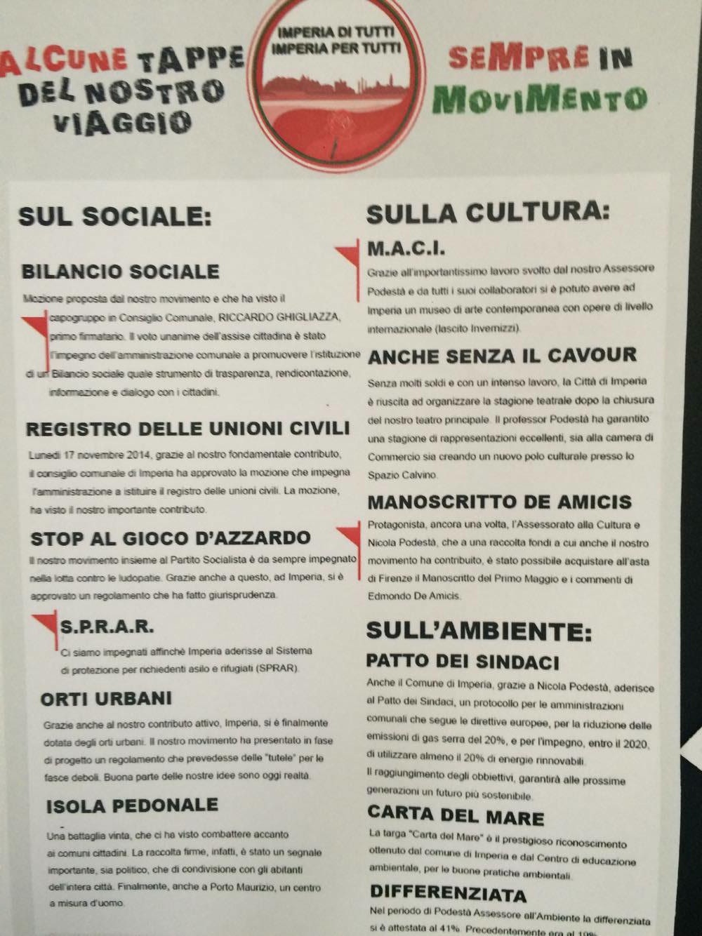 “L’incontro – commenta Claudio Luppi , coordinatore di Imperia di Tutti – è stato partecipato, la sala era piena, abbiamo voluto fare questo incontro perché “Imperia di Tutti” ritiene che sia opportuno rivolgersi alla cittadinanza per fare il punto dei progetti e di quello che si è realizzato fino ad oggi. In questo incontro abbiamo voluto rilanciare discorsi propositivi rivolti ai cittadini e all’amministrazione di cui facciamo parte perché riteniamo che sia opportuno tornare a parlare di argomenti veri. Ci siamo un po’ persi negli ultimi mesi in piccole cose, in diatribe interne, in scontri e dichiarazioni fatte sui media. Con questo incontro siamo tornati a parlare di politica con la P maiuscola”.