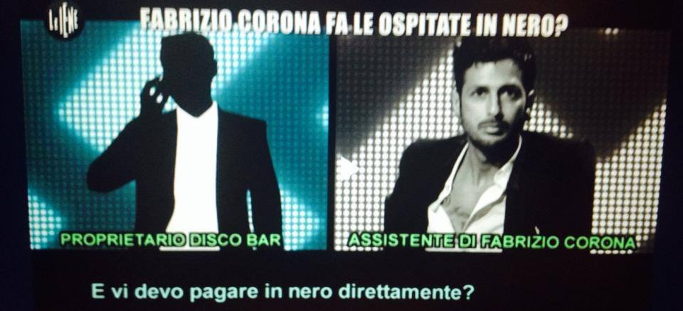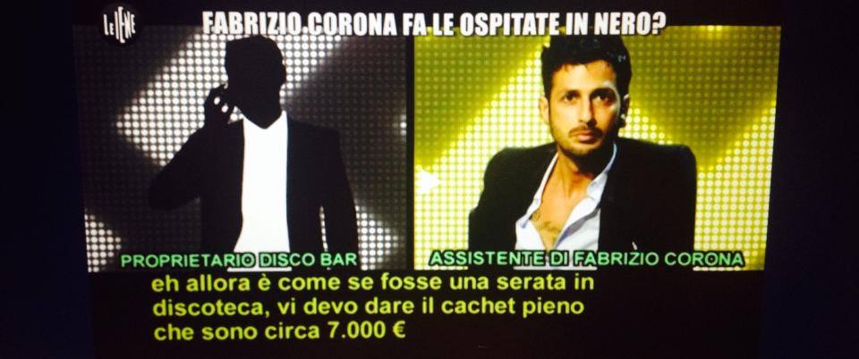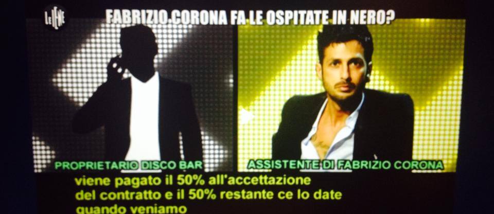 “Fabrizio Corona fa le ospitate in nero?”. E’ questo il titolo del servizio andato in onda ieri sera, domenica 9 ottobre, su Italia 1 nel corso del programma tv le Iene. Un servizio, a cura della “Iena” Filippo Roma, teso a scoprire se il discusso show man si faccia o meno pagare in nero per le sue ospitate nei locali di tutta Italia.