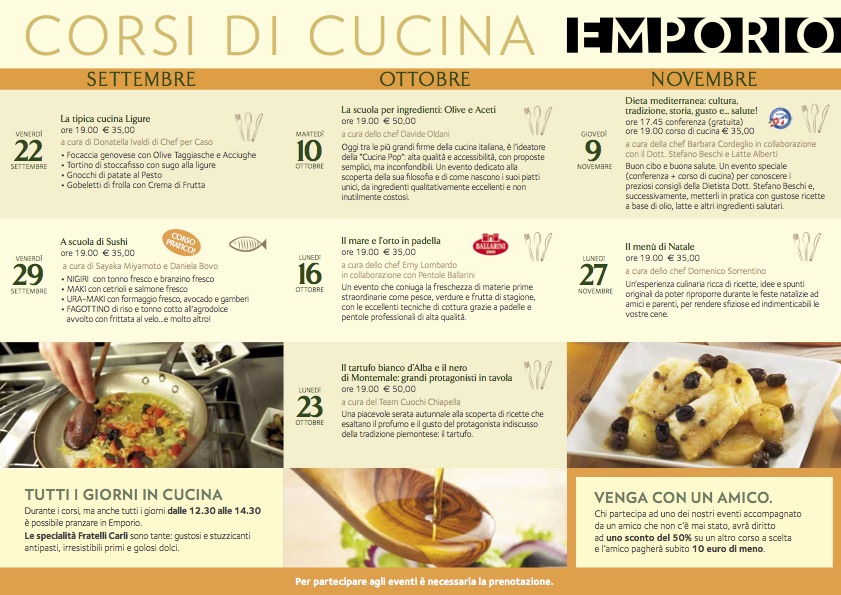 Tre mesi con un calendario fitto di iniziative per tutti i tipi di gusti in cucina toccando la cucina regionale ligure, il sushi, passando per suo maestà il tartufo, corsi tematici per ingredienti e concludendo il bellezza con il menù di Natale. Per tutti i corsi è indispensabile prenotare via telefono: tel. 0183 711493 o via mail emporio@oliocarli.it