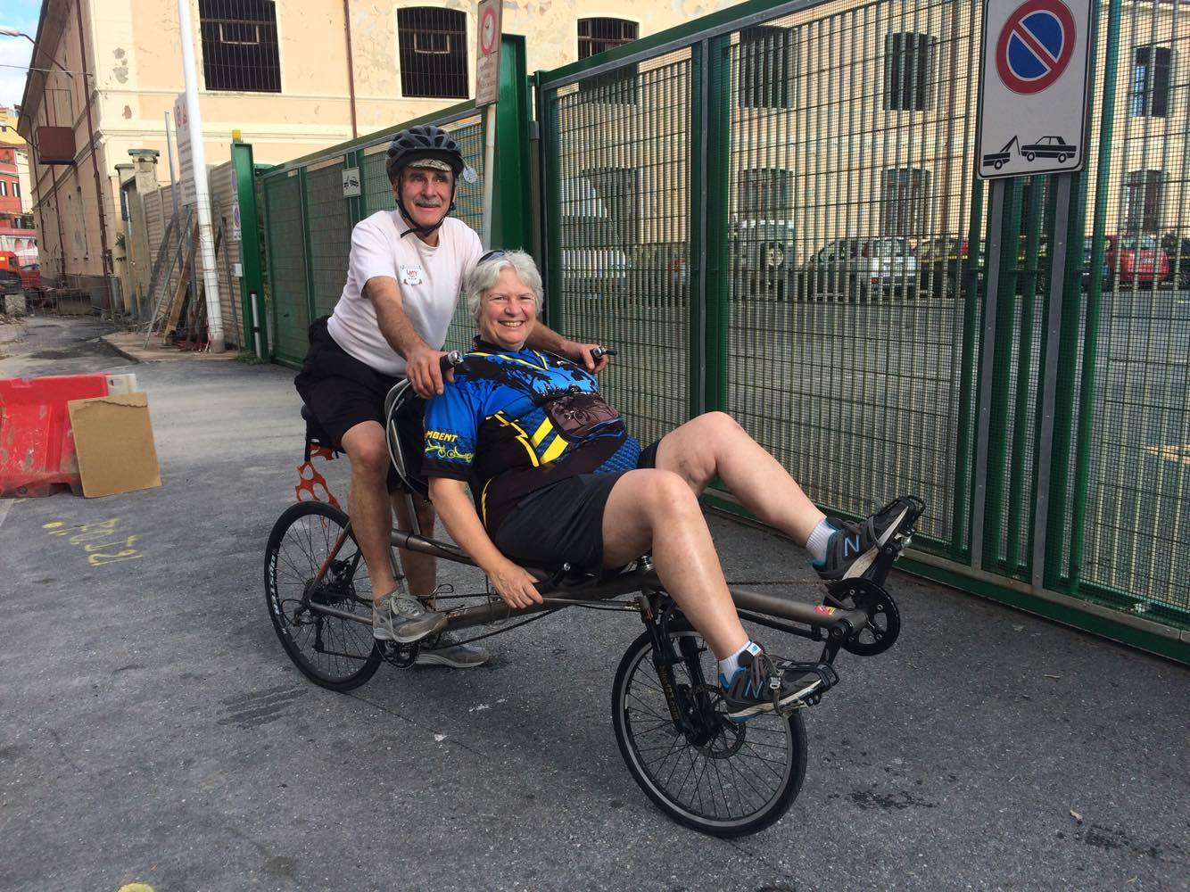 Questa mattina sono partiti alle 7 da Nizza sono sbarcati a Montecarlo un’ora dopo per salire in sella ai loro tandem e percorrere la costa, attraversando il confine di Stato, fino a Calata Cuneo a Oneglia. Lungo la strada hanno percorso la pista ciclabile da Ospedaletti fino a San Lorenzo al Mare per poi proseguire sull’Aurelia. “Ci è piaciuta molto la costa – commentano i cicloturisti a ImperiaPost- saremmo dovuti arrivare a Sanremo ma per problemi di disponibilità del porto abbiamo allungato la strada di 25/30 km. Stasera ripartiamo a bordo della nave alla volta di Piombino, ci piacerebbe però tornare qua in Liguria in uno dei nostri prossimi viaggi”.