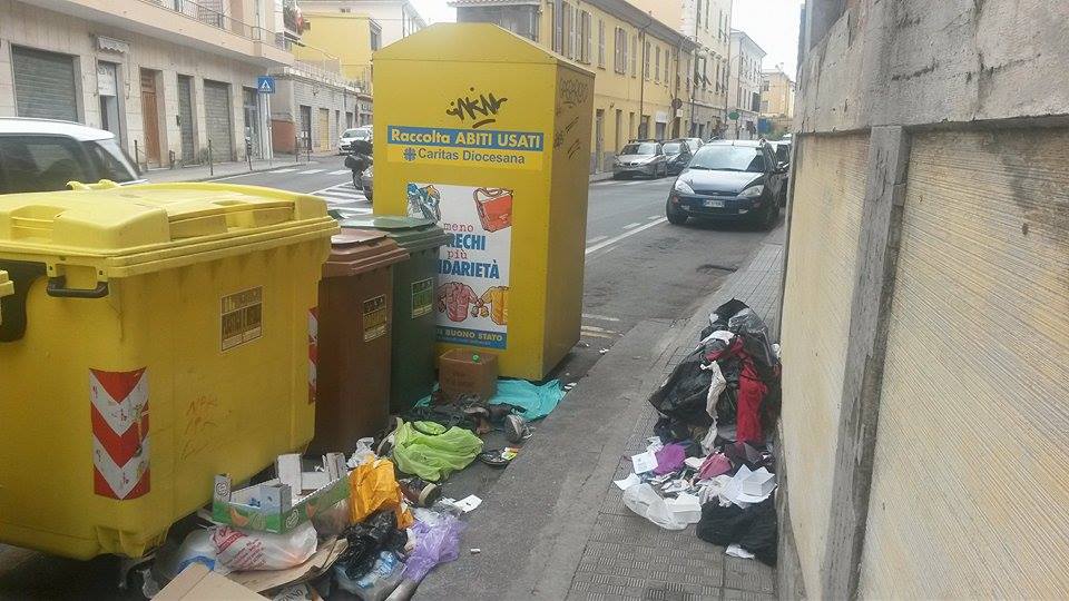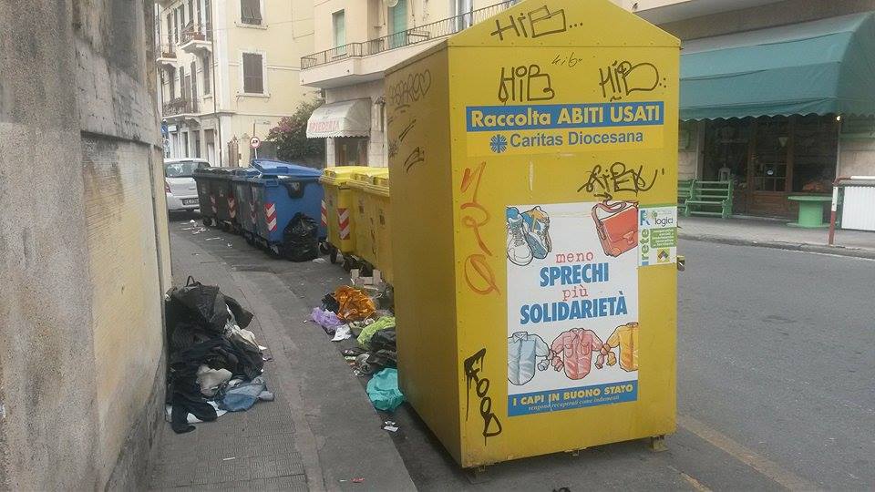 Un’altra zona della città in cui si ripropone lo stesso triste scenario è via XXV Aprile, dove il punto del marciapiede vicino ai bidoni della raccolta differenziata è spesso ricoperto da indumenti usati e rifiuti di ogni genere.