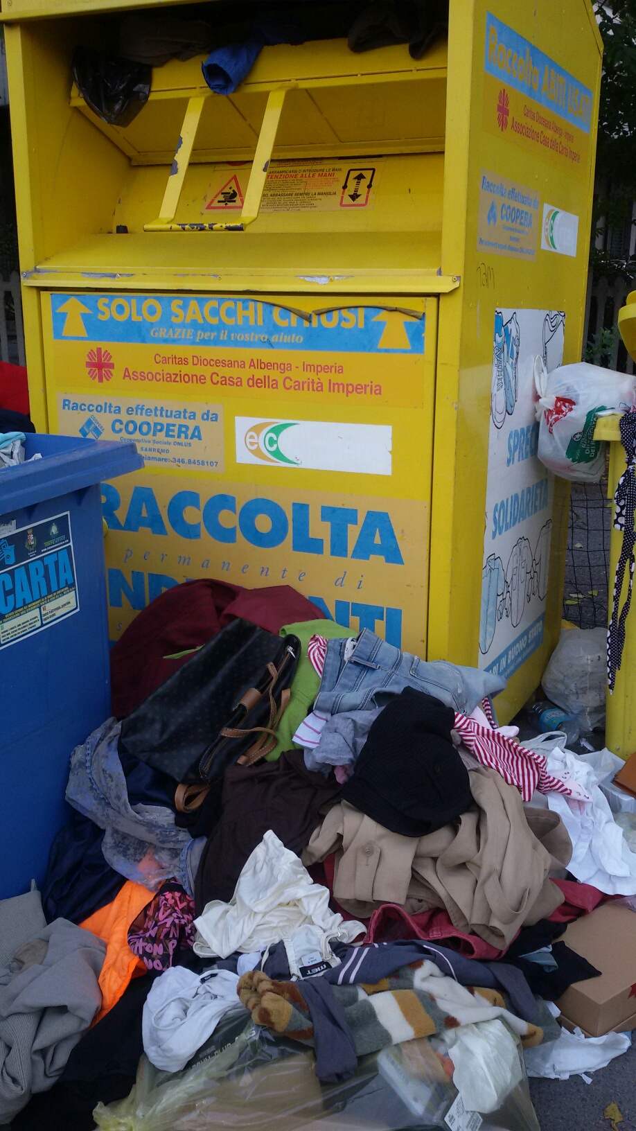 La seconda riguarda il centro di Oneglia, al termine di via Parini. Una montagna di indumenti si trova riversata sulla strada, tra i bidoni della raccolta differenziata. I vestiti usati, indirizzati alla Caritas, andrebbero riposti in sacchetti chiusi e poi inseriti all’interno dell’apposito bidone giallo, in modo tale da essere poi prelevati per destinarli ai bisognosi. Questi, invece, sono stati abbandonati a terra assieme agli altri rifiuti.