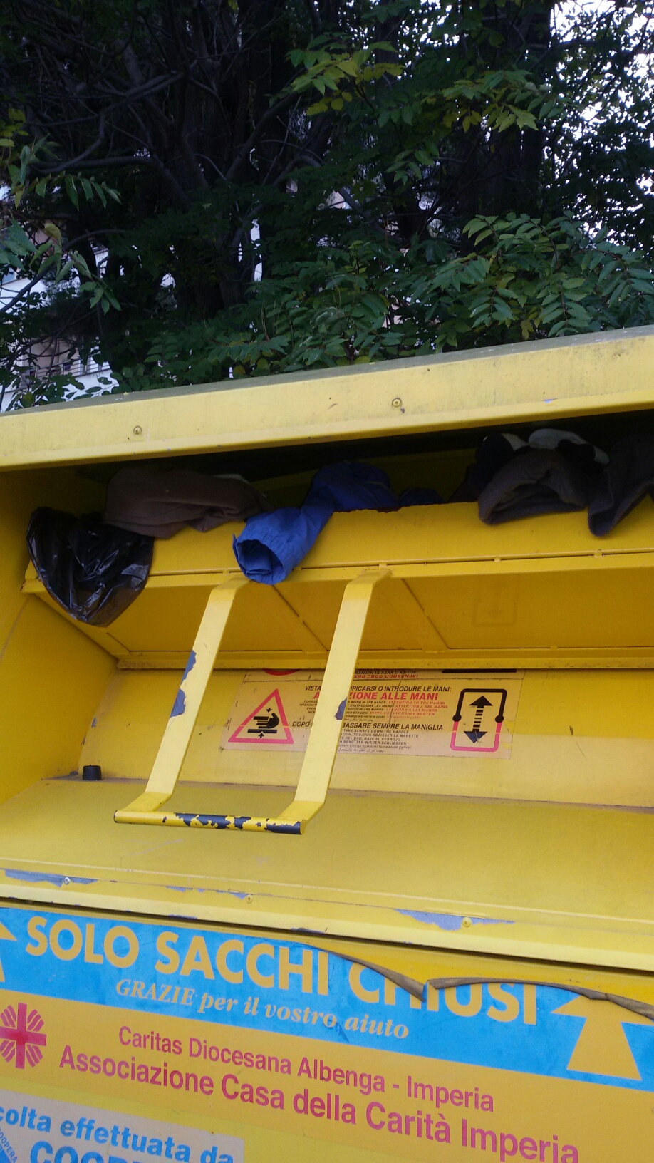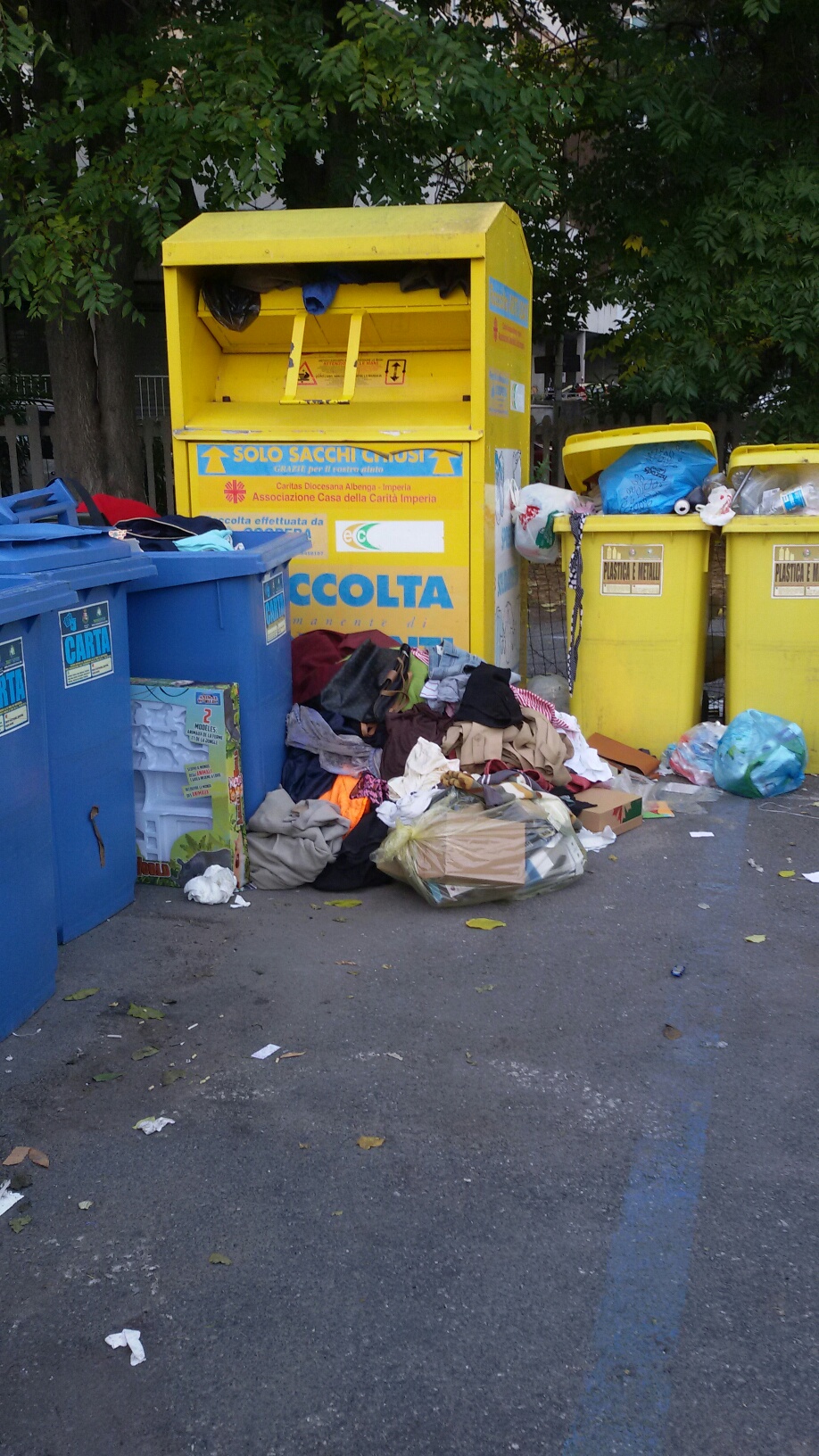 IMPERIA. Ancora segnalazioni riguardo situazioni di degrado e sporcizia in diverse zone della città. Rifiuti ingombranti abbandonati vicino ai bidoni e indumenti usati, destinati ai bisognosi, buttati a terra.