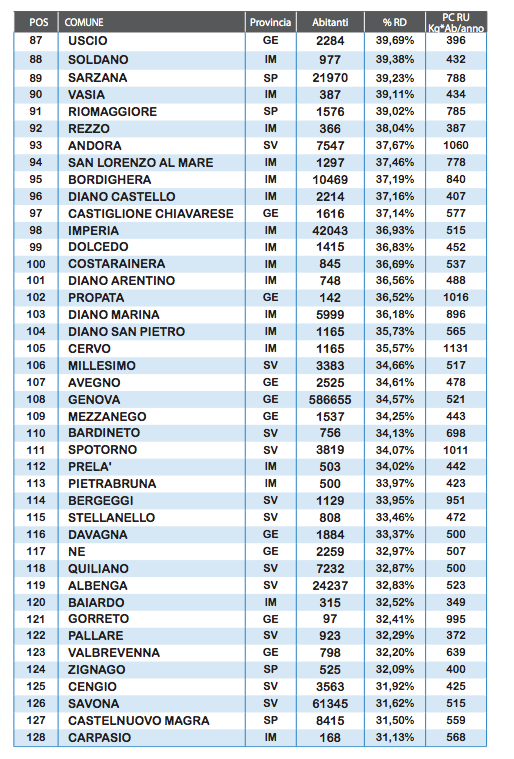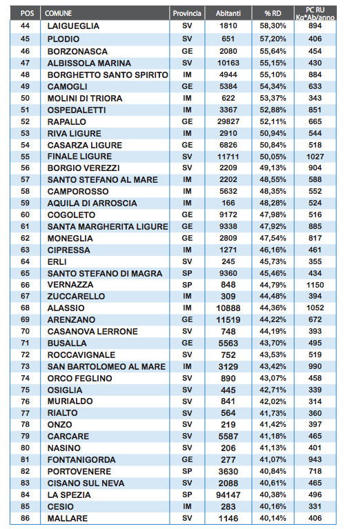 Nella provincia della Spezia il Comune di Arcola entra in classifica con il 71,29% compiendo un balzo di 20 punti percentuali così come, dopo aver sfiorato l’ingresso lo scorso anno, riescono il comune di Ameglia col 69,95% (+7% sul 2014) e quello di Framura 65,67% (+3,60%). Conferma invece per Levanto al 69,74% con una leggerissima flessione di 0,52 punti. Il risultato complessivo dei comuni spezzini si attesta sul 37,55% (+5,40%), mentre il comune della Spezia è il migliore dei comuni capoluogo raggiungendo il 40,38% (+2.16%).