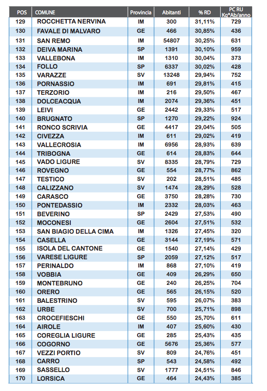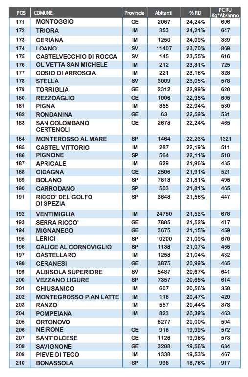 La provincia di Imperia, con soli tre comuni “ricicloni”, è la peggiore fra le quattro liguri con il 35,02%. Per quanto concerne la città di Imperia, nonostante un aumento della percentuale di raccolta differenziata pari al 5,78%, resta ampiamente sotto la soglie del 65%, con un desolante 36,93%.